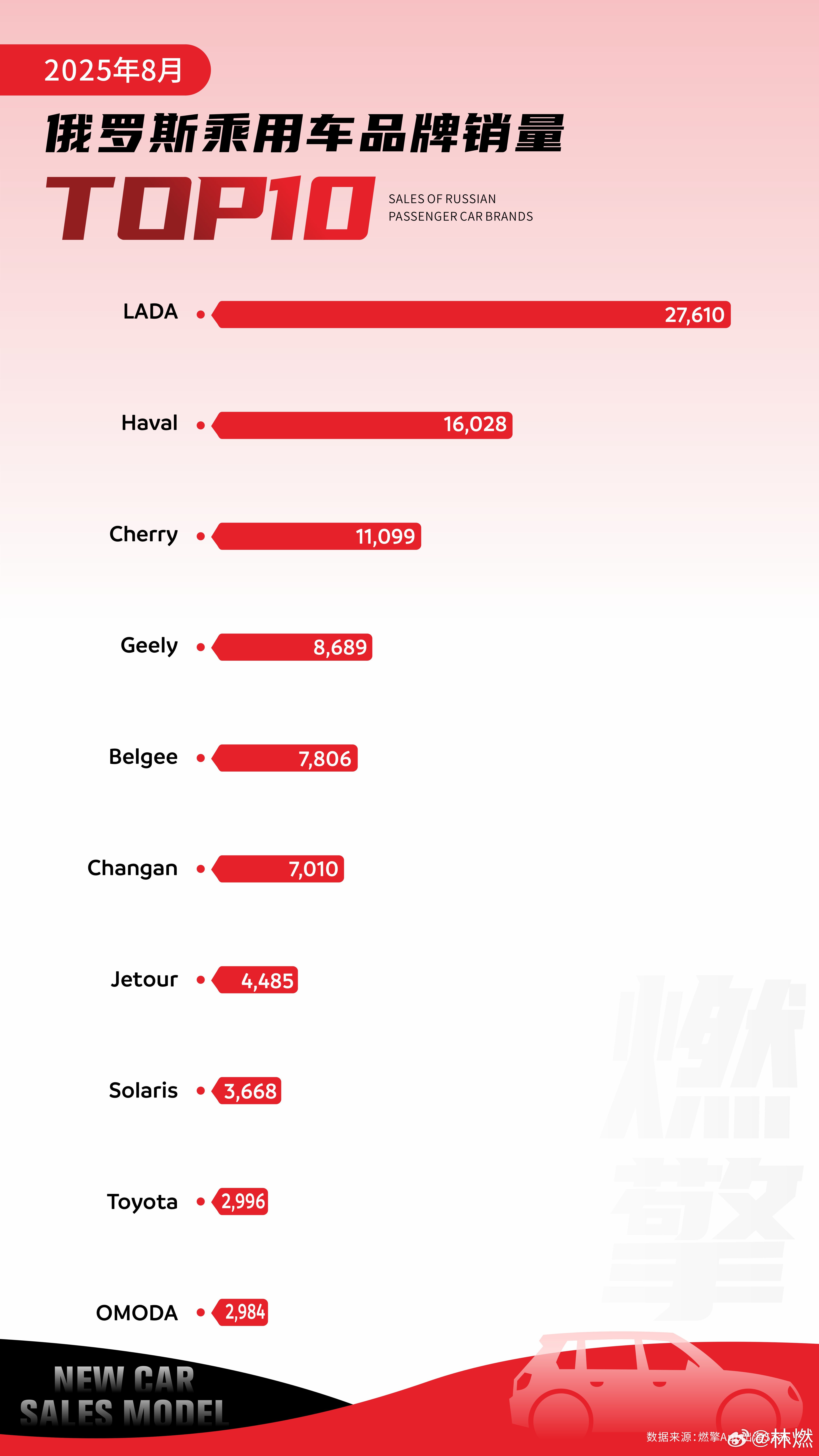 8月俄罗斯乘用车市场呈现本土品牌LADA守基本盘、中国品牌集体强势渗透、日系品牌大幅边缘化的格局,中国车企成为市场份额重构的核心力量。