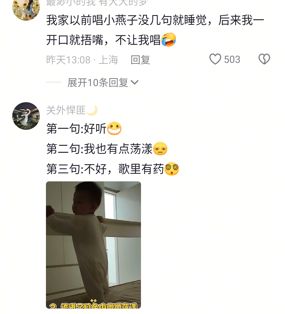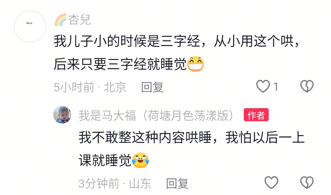 小孩:妈妈唱的好难听,但只要我一躺下她就不唱了,我真聪明