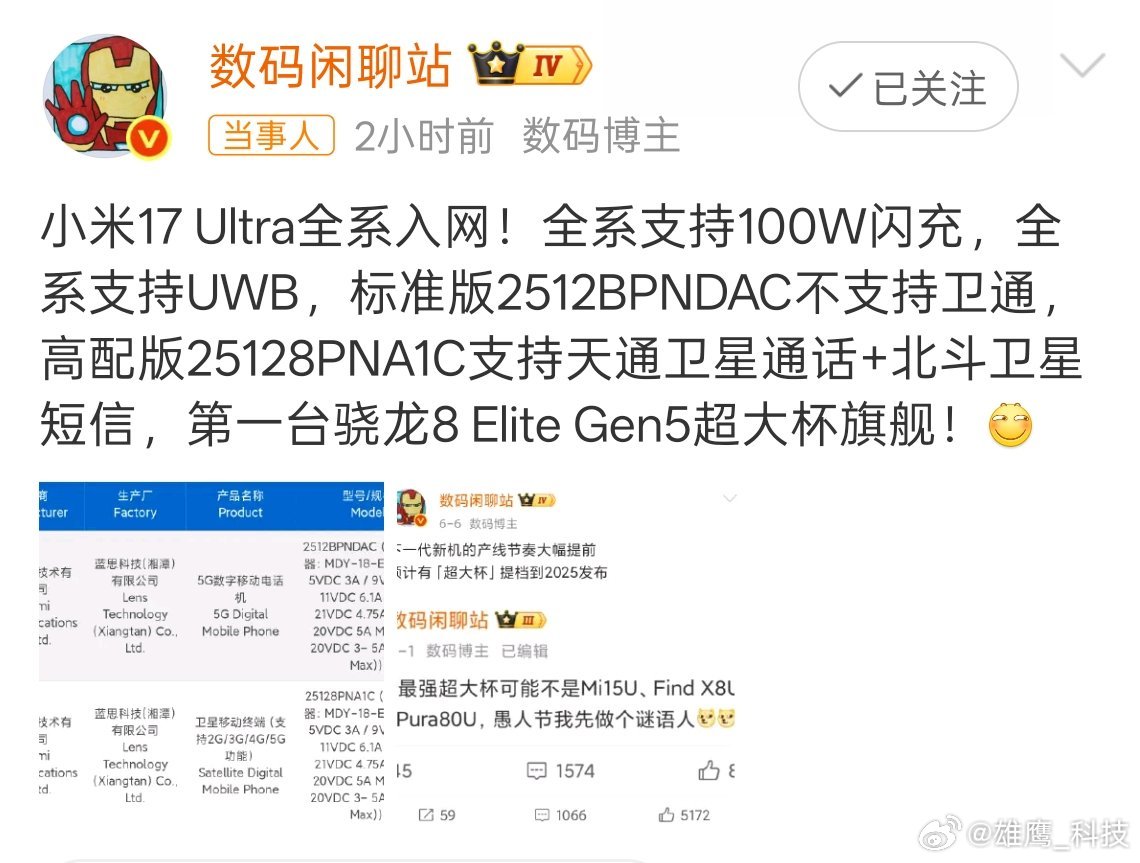 小米17UItra已全系入网,骁龙8 Elite Gen5+双卫星通话。