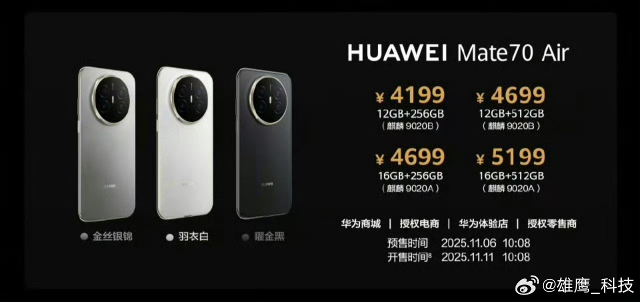 华为Mate 70 Air机身厚度仅有6.6mm,重量约208g。这么轻薄的手机, 这次还提供两款麒麟CPU版本,分别是麒麟9020B、麒麟9020A,而且在价格上也给出了明确的标注。