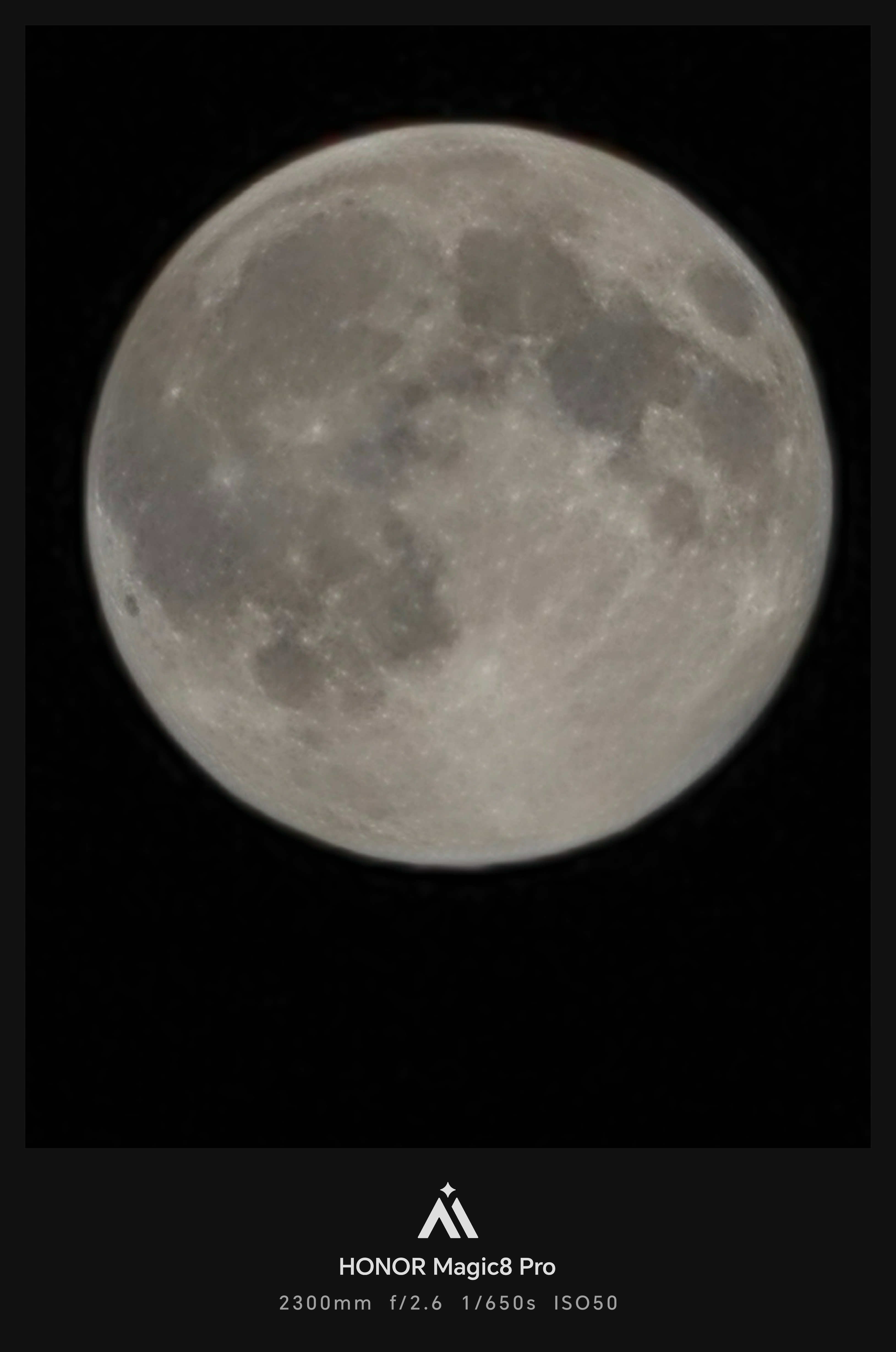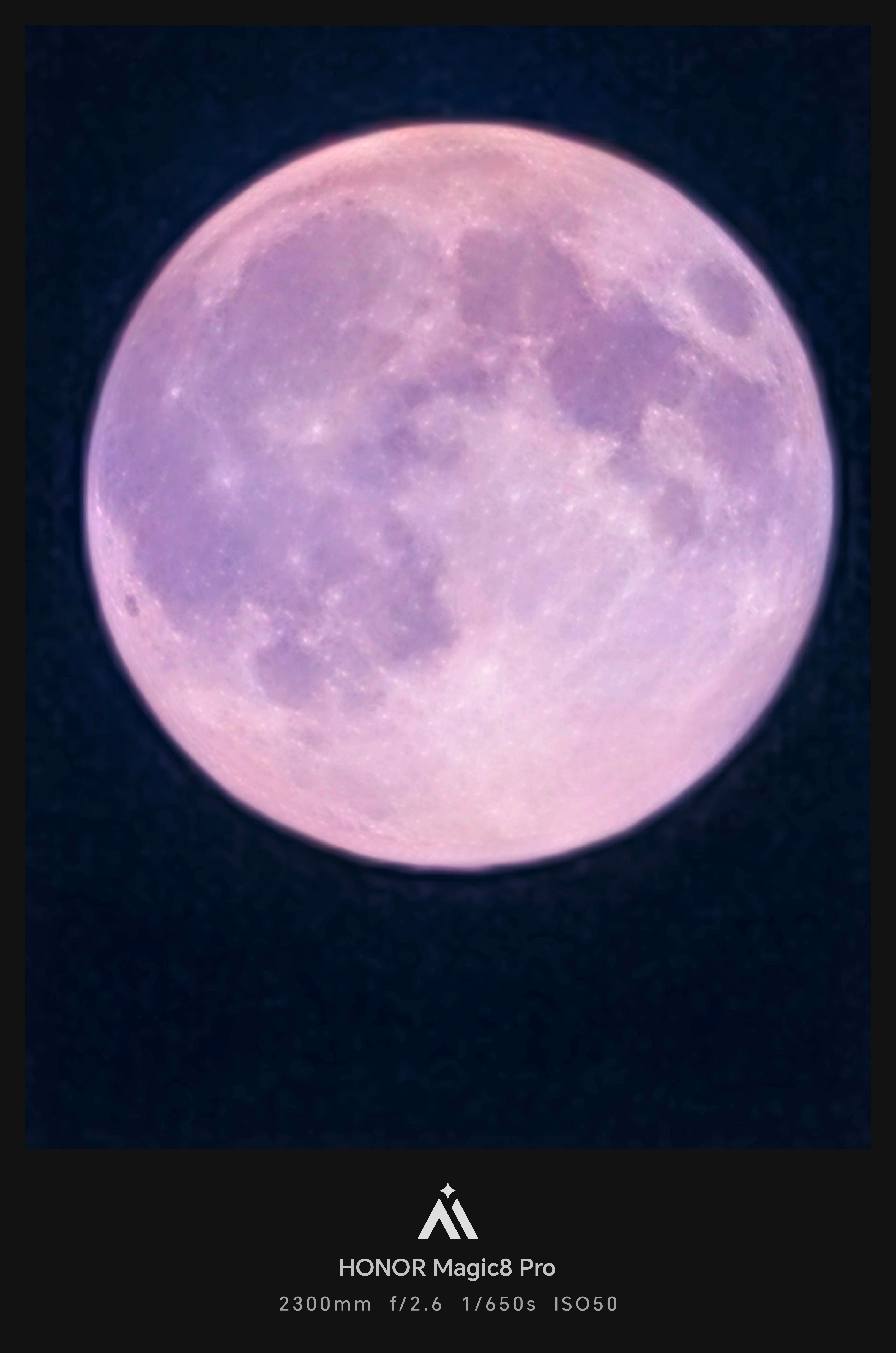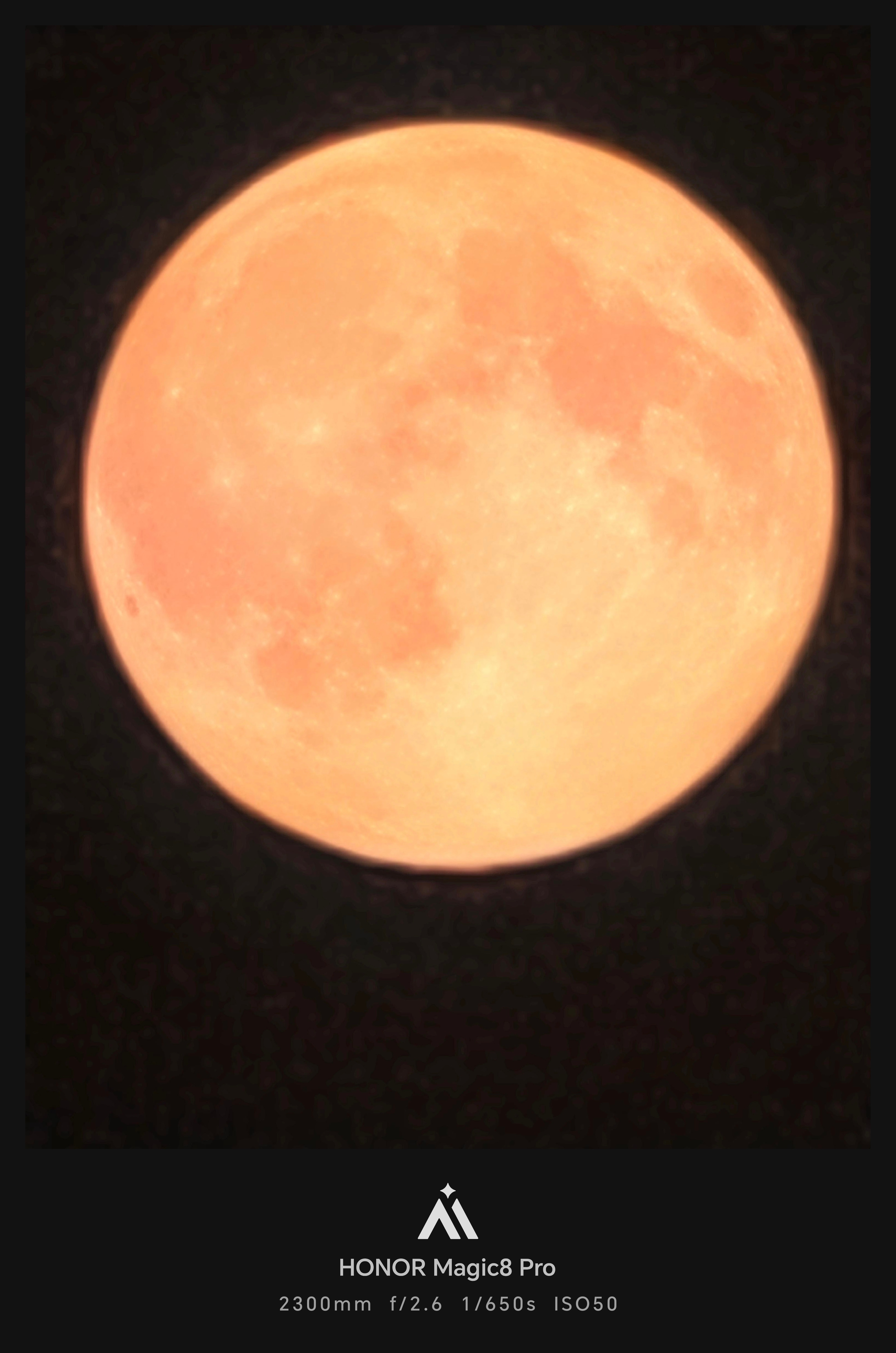 昨晚用荣耀Magic8 Pro拍的月亮(图一),黑色金框水印很搭,后面两张是AI追色,别有一番风味。