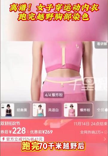 “这下尴尬了!”浙江杭州,女子去参加70公里越野赛,可跑到终点后却发现,胸前的衣服上竟然变成了粉色,而且只有胸前的一块,找到原因是当天穿的粉色运动内衣掉色了,可找到商家,对方却表示:汗液腐蚀正常,可以赔30元! 11月4日下午,杭州城西越野赛终点线旁,52岁的李姐刚冲过终点,还没来得及接过完赛奖牌,就被身边跑友的一句玩笑话僵在原地。 李姐,你这是冲线太激动,蹭到什么粉色东西了?顺着跑友的目光低头一看,她瞬间满脸发烫。 只见身上那件399元的鹅白色速干衣,胸前晕开一大片不规则的粉红,汗渍浸过的边缘还泛着深浅不一的印记。 当天杭州气温飙到32℃,70公里的赛道里一半都是爬坡路段,李姐全程汗流浃背,后背的衣服拧一把都能出水。 比赛时满脑子都是“再坚持几百米”,压根没留意胸前的异样。 直到冲线后被围观者的目光盯得发慌,她才在补给站的僻静角落脱下雨衣检查,翻到速干衣内侧的同款粉印时,才发现是里面那件239元的飞比特运动内衣在“作祟”。 这件内衣是她特意为高强度赛事选的“专业款”,赛前还洗过三次,机洗时连一点浮色都没掉,谁想到第一次在赛道上“实战”就掉了链子。 更让她糟心的是皮肤状况,胸口的皮肤被染成淡粉色,用清水搓了好几遍才勉强淡化,当晚还泛起轻微的干涩感。 我跑了5年越野,衣柜里十几件运动内衣,从几十块到几百块的都有,从没见过出汗就能染皮肤的。 李姐说,那件被染色的速干衣是她最常穿的装备,如今粉红印记洗不掉,彻底没法再穿,两件衣服加起来损失了六百多块。 赛后第二天,李姐带着衣服照片和购买记录找到商家客服,得到的回应让她气不打一处来。 客服先是说“运动时大量出汗,汗液腐蚀导致掉色是正常现象”,见她不接受,又抛出“商品已过三个月售后期”的说法。 最后甩来一张30元的购物优惠券,说“这是最大权限的补偿,下次购物才能用”。 李姐反问“专业运动内衣连出汗都扛不住,还叫什么专业款”,对方却只重复“按规定处理”,再也没多说一句。 无奈之下,李姐把经历发到运动圈,没想到半天就引发热议,有跑友留言说自己去年跑马拉松时,穿某品牌深色内衣被染成“紫胸侠”,维权时商家也是同样的说辞。 还有网友翻出涉事品牌的商品详情页,发现“流汗不闷汗”的宣传语格外显眼,却从头到尾没提过“可能掉色”的提示。 更让大家意外的是,李姐联系平台投诉后发现,涉事内衣还在正常售卖,甚至没有添加任何掉色风险提示。 根据国家纺织品标准,运动内衣的汗渍色牢度必须达到4级才算合格,而李姐送检后拿到的报告显示,涉事内衣的汗渍色牢度仅为2级,远低于标准。 汗液里的盐分确实会影响色牢度,但合格的运动服装在设计时就该考虑到高强度运动场景,这根本不是甩锅的理由。 浙江泽大律师事务所的陈律师也表示,商家以“过售后期”为由拒绝担责站不住脚。 产品质量问题的追溯期不受售后期限制,李姐手里的购买记录、染色衣物和检测报告,都能作为维权依据,不仅能要求退货退款,还能主张受损速干衣的赔偿。 但他也提到,类似纠纷中,多数消费者因为检测费要两三百元、诉讼耗时长,最后只能接受商家的小额补偿。 从70公里赛道冲线的狂喜,到发现染色的窘迫,再到维权路上的奔波,李姐的经历戳中了不少消费者的痛点。 大家花几百块买专业运动装备,图的从来不是颜色多亮眼,而是能在汗流浃背时靠得住、不添乱。 商家口中的“汗液腐蚀正常”,本质上是对品质的懈怠,更是对消费者权益的漠视。 消费者权益保护从来不是一句口号,它藏在每件合格的商品里,藏在商家负责任的态度中。 就像越野赛里支撑跑者完赛的不是花哨的衣服,而是扎实的品质,守护消费者信心的,也从来不是敷衍的补偿,而是实打实的责任担当。