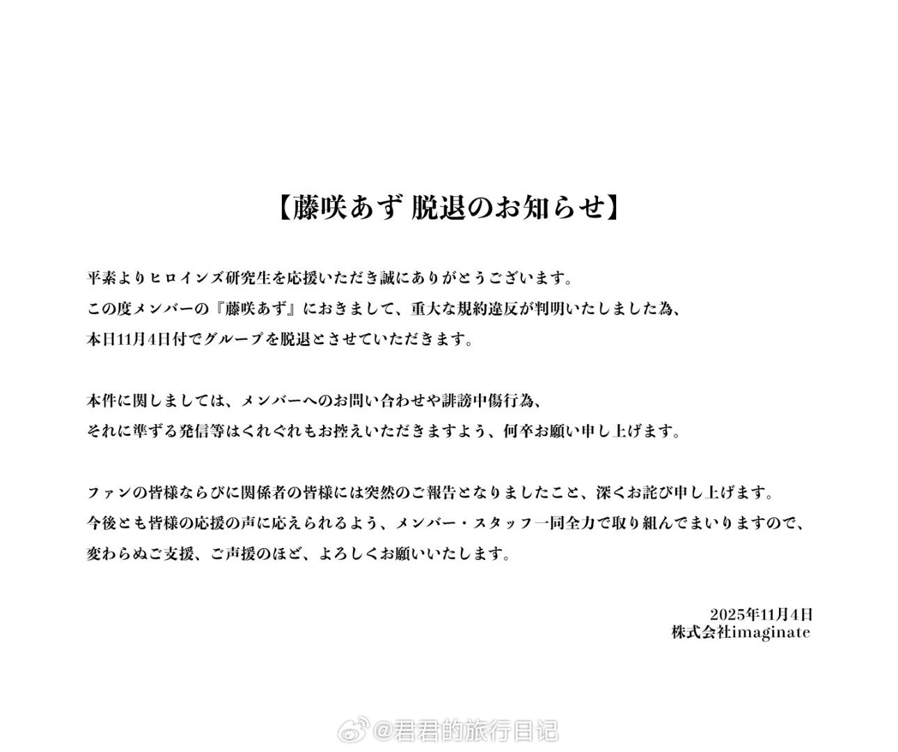 日本地下偶像团体的一名成员,因为发这张照片,直接被退团了。