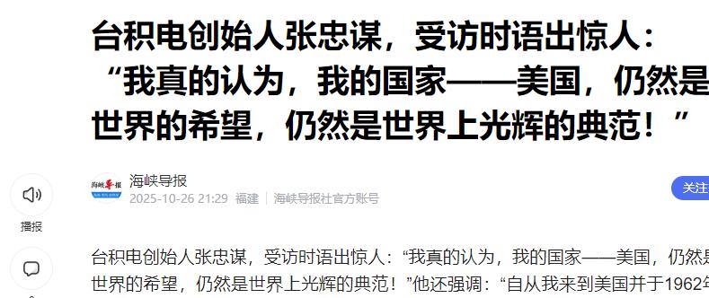 [微风]“我真的认为,我的国家——美国,仍然是世界的希望,仍然是世界上光辉的典范!”当台积电创始人张忠谋面对美国媒体说出这句话时,整个华人世界都为之震动。 他甚至补充道:“自从我来到美国并于1962年入籍以来,我的身份一直是美国人,除此之外别无其他!”这 番话,从一位1931年出生于浙江宁波、被尊为“芯片大王”“半导体教父”的老人嘴里说出来,分量格外沉重。 张忠谋的身份,早已超越了普通的企业家,他的一言一行,都被视为全球半导体产业的风向标。 然而,这番言论背后,究竟是一种清醒的现实主义,还是一种身份的彻底背离? 张忠谋的人生,本身就是一部浓缩的近代史。他幼年因战乱颠沛流离,从南京到广州,从重庆到香港,1949年赴美求学,成为哈佛大学当年唯一的中国新生,后来转入麻省理工学院,再在斯坦福大学获得电机博士学位。 他的职业生涯起步于美国德州仪器,从普通工程师一路做到集团副总裁,成为最早进入美国大型公司最高管理层的华人。 1985年,他应台湾方面邀请回台,出任工业技术研究院院长,并于1987年创办了全球第一家专业晶圆代工公司——台积电,彻底改变了半导体行业的游戏规则。 可以说,他的成功,既是个人的奋斗史,也是全球化时代人才流动与产业转移的缩影。 然而,正是这样一位深谙全球产业格局的“教父”,近年来却屡次在公开场合对中国芯片产业泼冷水。他不止一次表示,如果美国想扼杀中国芯片产业,中国真的无能为力。 他甚至认为,大陆半导体想要领先的机会微乎其微,因为技术壁垒太高,而美国及其盟友已经控制了所有关键环节。 这种论调,与他在美国媒体面前强调“美国人”身份的行为,形成了奇妙的呼应。这背后,既有他作为台积电创始人的商业考量——毕竟台积电高度依赖美国市场和技术生态,也有他对地缘政治现实的判断。 但是,事实真的如张忠谋所言吗?当我们把目光从他的言论转向中国芯片产业的实际进展时,另一幅截然不同的画卷正在徐徐展开。 2025年的数据摆在那里,中国芯片产业的韧劲儿和爆发力,已经不容任何人忽视。根据多家权威机构的统计,中国芯片设备的自给率正以惊人的速度攀升,从2022年的约10.7%,到2023年的11.7%,再到2024年预计的20%以上。 更有预测显示,到2025年,这一数字有望突破30%,甚至达到50%。在28纳米及以上成熟制程领域,国产设备几乎已经实现了全覆盖,自给率超过80%。这意味着,在关乎国计民生的大部分芯片领域,中国已经基本摆脱了对外部的依赖。 更令人振奋的是,这种替代并非停留在低端层面。中芯国际、华虹半导体等龙头企业,2025年的产能利用率分别攀升至92.5%和108.3%,接近甚至超过满产状态。 中芯国际的北京、深圳12英寸晶圆厂,华为海思推出的麒麟9010芯片,已经采用了中芯国际的N+2工艺,实现了规模量产。国产28纳米光刻机完成了整机联调,计划在2026年实现产业化。 在刻蚀机、薄膜设备等关键领域,以北方华创、中微公司为代表的国产厂商,已经跻身全球第一梯队。这些进展,正在一步步重塑全球半导体产业链的格局。 张忠谋或许没有错,他看到了美国在尖端制程领域的绝对优势,看到了EUV光刻机被卡脖子的现实困境。 但他可能低估了中国人民在压力面前迸发出的巨大能量,低估了中国市场的体量和政策的决心。当外部封锁越紧,内部的自主动力就越强。这不仅仅是技术问题,更是一种民族精神的体现。 从“两弹一星”到载人航天,历史已经反复证明,任何外部的打压,最终都会转化为中国自力更生的催化剂。 张忠谋的言论,像一面镜子,照出了全球化时代个人身份认同的复杂性,也照出了大国博弈下科技产业的残酷现实。 他选择了美国,那是他的自由。但中国芯片产业,却选择了一条更艰难、也更光荣的道路。这条路,注定不会平坦,但每一步都走得踏实、坚定。 当中芯国际的晶圆在满负荷运转,当国产设备在产线上稳定运行,当一个个技术瓶颈被攻克时,我们看到的,不仅仅是产业的崛起,更是一个民族在逆境中不屈的脊梁。 面对这样的现实,我们不禁要问:一个人的身份认同,究竟是由他的国籍决定,还是由他的血脉和情感归属决定?当科技的洪流滚滚向前,是选择依附于现有的霸权体系,还是勇敢地去开创一个属于自己的未来? 张忠谋给出了他的答案,而中国芯片产业,正在用行动书写着另一个答案。对此,你又有什么看法呢?