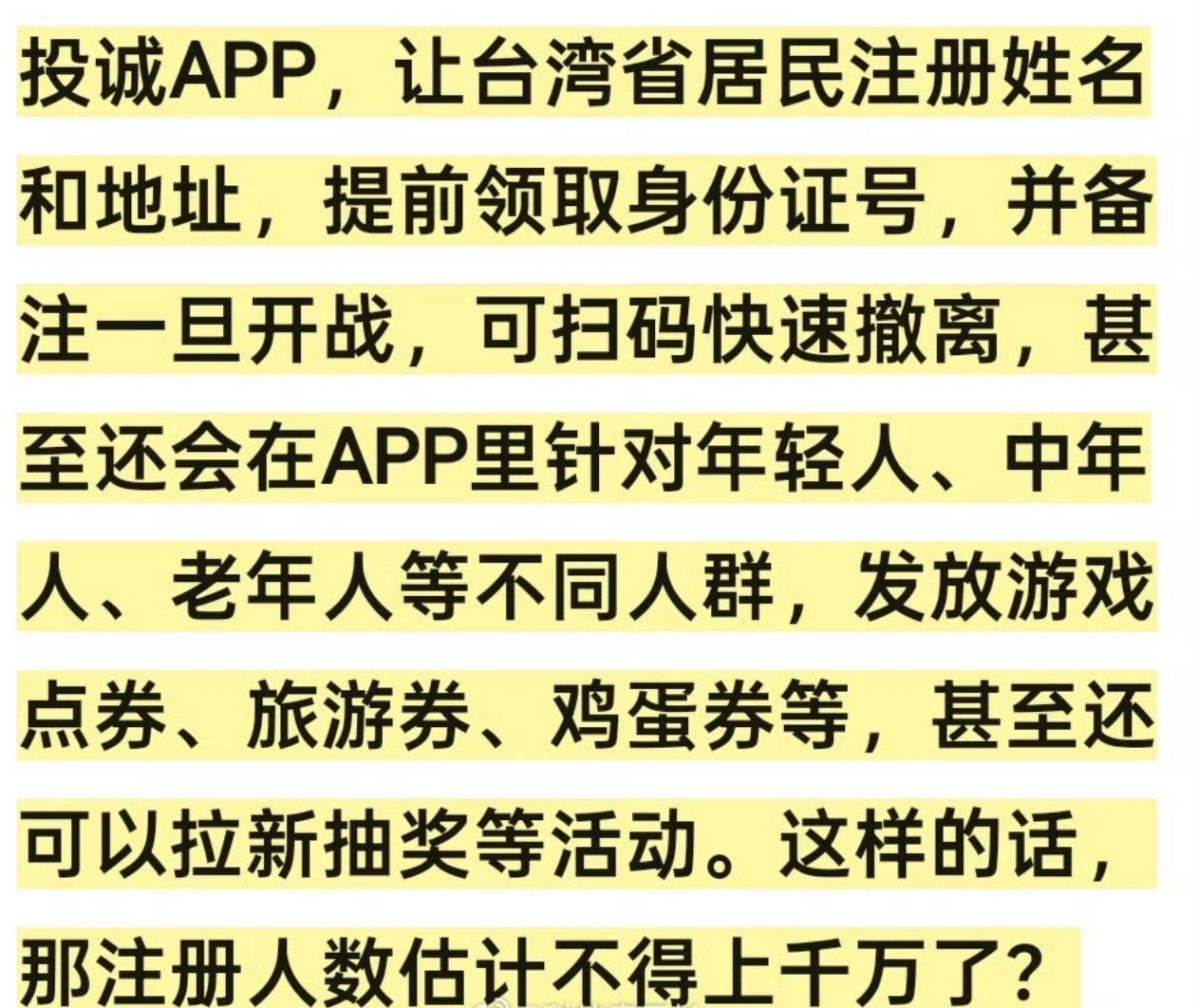 我的天啊,难怪民进党会破防,还真的有台湾投诚app啊!我原本以为就是营销号自嗨,原以为是假的,没想到是真的不说,还做的这么高大上,面面俱到!看来《沉默的荣耀》播出的含金量还在上升,文化统战有的时候影响力真的很高啊! 投诚app的用途是让台湾省居民注册姓名地址,提前领取身份证,一旦开战,可扫码快速撤离!甚至还时不时的给年轻人,中年人,老年人发放礼品券,购物券,鸡蛋等等生活用品!这想的也太周到了吧! 关键是这个讯息证明解放台湾真的快了!都进行到这一步了!所以民进党才会慌乱!一键投诚系统