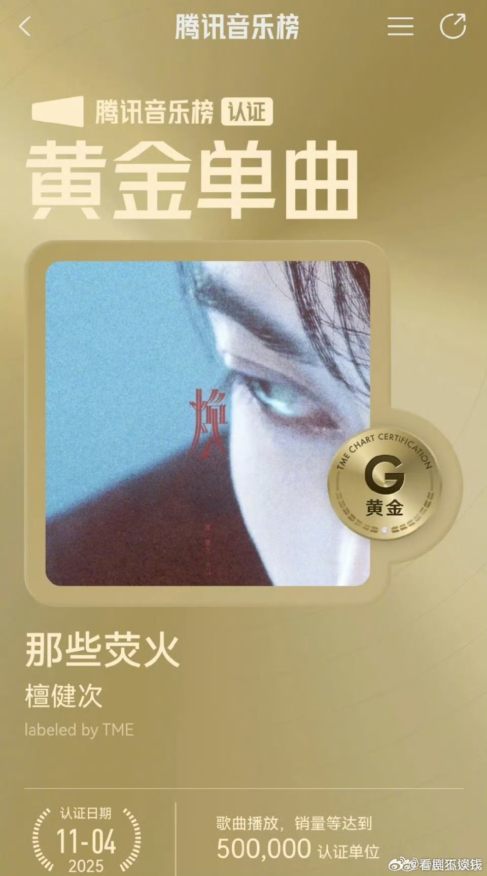 肖战《归零》、檀健次《那些荧火》11月4日获得🐧音乐榜黄金单曲认证!!好厉害