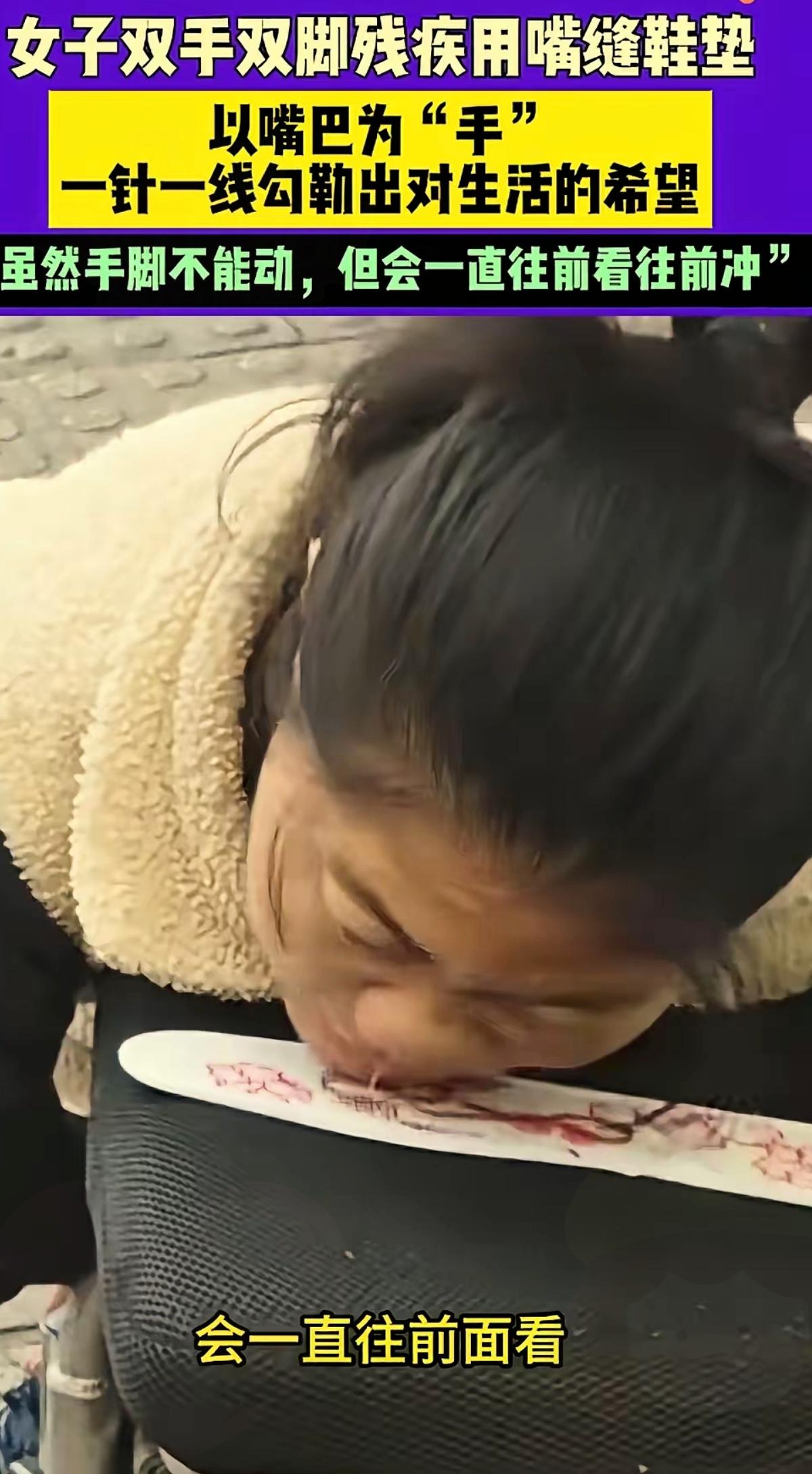 谁看了不心疼? 重庆街头,一位双手双脚残疾的女子跪坐在地上,用嘴巴叼着针线为鞋垫绣花,动作娴熟得让人难以置信。 她天生残疾,双手畸形无法使用,双脚也无法正常行走,却在离婚后独自抚养两个女儿。靠着这双“嘴”,她一针一线绣出精美的鞋垫,每只都要耗时一两个小时,背面针脚整齐得无可挑剔。 当有人同情她时,她只是平静地说:“我嘴巴还能动,眼睛还能看,我还年轻,我要往前面冲!”这句话,比任何豪言壮语都更有力量。 我们总抱怨生活太难,可看看这位姐妹——她连“动手”都成了奢望,却用最原始的方式,为自己和孩子撑起一片天。真正的强大,不是没有眼泪,而是含着眼泪依然向前奔跑。 你最近一次被普通人的坚韧打动,是在什么时候?