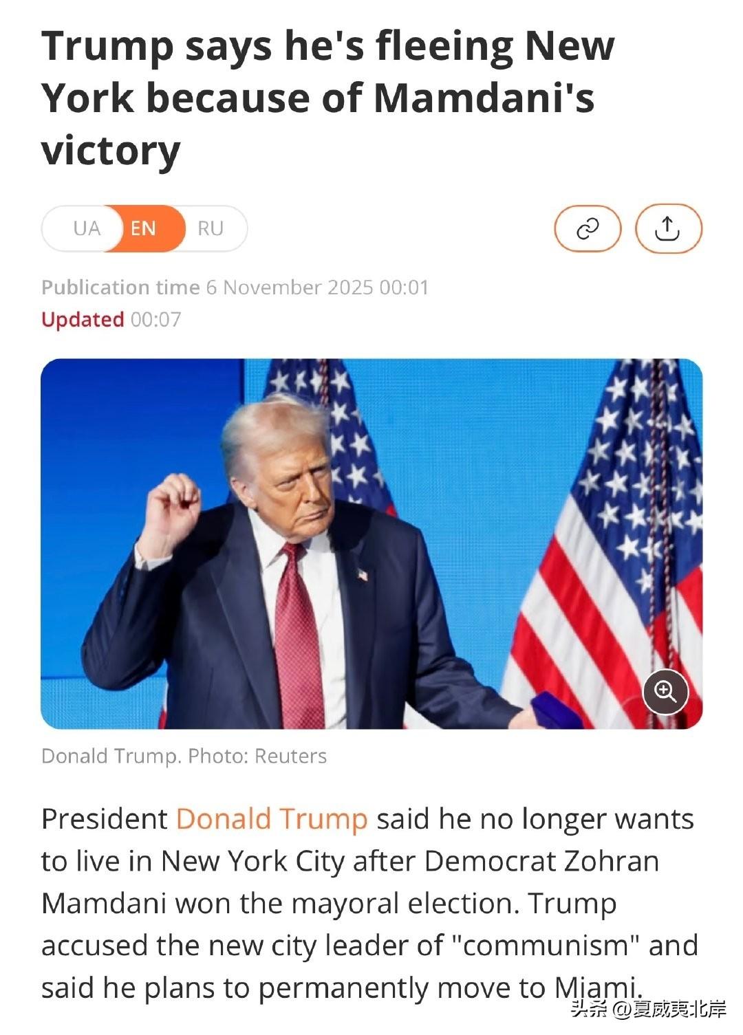 美国总统川普表示,在民主党人Zohran Mamdani赢得市长选举后,他不再想住在纽约市。川普指责这位新任城市领导人搞“共*主义”,并表示他计划永久搬往迈阿密。
