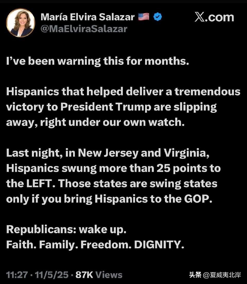 共和党众议员Maria Salazar称此次选举惨败的原因是西班牙裔选民的流失。 “几个月来我一直在警告这件事。 曾帮助川普总统取得巨大胜利的西班牙裔选民,正在我们眼皮底下悄然流失。 昨晚,在新泽西州和弗吉尼亚州,西班牙裔选民向左翼(民主党)摇摆了超过25个百分点。 这些州之所以是“摇摆州”,唯一的前提是你能把西班牙裔选民拉进共和党。 共和党人:醒醒吧。 信仰、家庭、自由、尊严。”