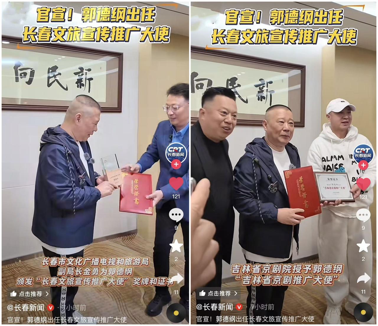 郭德纲长春之行,收获是真丰富,受聘长春文旅和吉林省京剧院,获得了“长春文旅宣传推广大使”和“吉林省京剧推广大使”的头衔。长春新闻在抖音,对郭德纲参观长春历史博物馆以及接受聘书的相关内容进行了报道。本周五,郭德纲将带领麒麟剧社在吉林市唱京剧《济公活佛》第七本。周六,郭德纲、于谦将在长春举办相声专场。相声专场、京剧专场的门票目前均已经全部售罄。