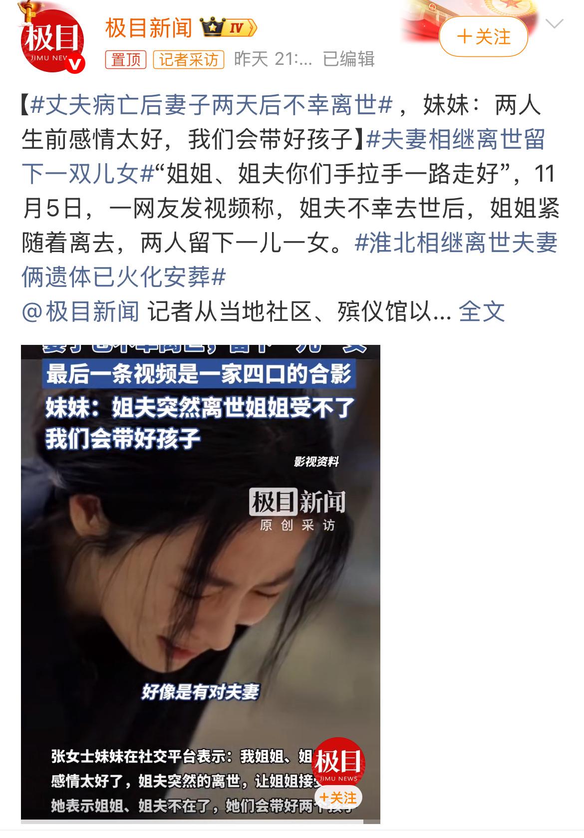 这几天,安徽淮北发生的一件事,让无数人心里发酸。一对一起经营美容美发店十多年的夫妻,在11月初的三天里相继离世,留下的故事让人唏嘘不已。 11月1日,52岁的丈夫王磊(化姓)突发疾病,从送医到离开不到半小时,没给家人留下一句话。他的妻子张敏(化姓)当场就崩溃了,瘫坐在医院走廊,反复念叨“他怎么能丢下我”。接下来的两天,她不吃不喝,日夜守在丈夫灵前。11月3日凌晨,亲友发现她倒在灵前,最终因急性脑梗没能抢救回来。就这样,一对相伴18年的夫妻,真的做到了“生死相随”。 翻看张女士生前的社交账号,满屏都是幸福的痕迹。最后一条视频里,一家四口依偎在沙发上,她写着“愿我们一家永远平安喜乐”。置顶的是他们结婚18周年跳舞的视频,两人牵着手,笑得特别甜。邻居们说,他们“从来没红过脸”,每天一起开店、关店,手牵手回家,是街上最恩爱的模样。谁能想到,这样的幸福会戛然而止。 他们从摆摊理发做起,夏天顶太阳,冬天冻手,慢慢攒钱盘下店面。王磊会记得妻子不吃香菜,张敏总提醒丈夫少抽烟。他们不仅经营好了自己的小日子,还特别善良——王磊常去养老院免费理发,张敏会给社区孩子编辫子、发糖。就是这样一对好人,却以最突然的方式离开了。 最让人心疼的是他们留下的一双儿女。女儿刚上大学,儿子才十几岁。葬礼上,女儿抱着父母合影痛哭,小儿子还不太懂发生了什么,紧紧攥着姨妈的手问“爸妈什么时候回来”。张女士的妹妹已经承诺会抚养两个孩子,社区也在帮忙申请补助,但再多的帮助,也替代不了父母的陪伴。 这件事让我想了很多。他们的感情确实感人,在这个离婚率不低的时代,还能看到这样“连生死都无法分开”的爱情。但感动之余,更多的是心痛。心痛两个孩子瞬间成了孤儿,心痛这份深沉的爱情背后,是两个孩子未来没有父母参与的人生重要时刻。 我们常说“为母则刚”,不是说母亲不能脆弱,而是在孩子还需要我们的时候,那份责任往往能成为支撑我们活下去的力量。张女士的悲痛谁都能理解,但孩子失去了父亲后,又失去了母亲,这份双重打击实在太沉重了。 这件事也给所有夫妻提了个醒:珍惜眼前人,不仅是深爱对方,也是要为需要你的人好好活着。真正的爱不仅仅是浪漫的“生死相随”,更是在灾难来临时的“为你坚强”。毕竟,孩子是无辜的,他们需要父母的爱与陪伴。 你怎么看这件事?如果是你,会怎么做?欢迎在评论区分享你的想法。 来源:极目新闻