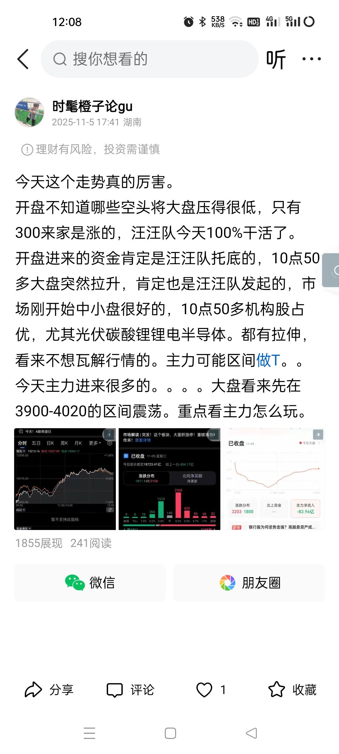 上午高开高走,,涨幅比较好的就是昨天机构进场的版块,光伏锂电碳酸锂半导体以及电网设备,还是机构股占优。 游资以及中小盘今天一塌糊涂。挑不起大梁的版块,游资开收割机进来收割了。。 昨天和前几天进场的都有利润。主力今天确实也有进场,但是先手他们已经拿了。再进去又是赌博了,确定性进场机会就是昨天。 越来越发现玩大盘的成功概率更高了,很多个股根本跟大盘不同步,被他们控制了,汪汪队也是狠角色,这市场玩法很特别的。