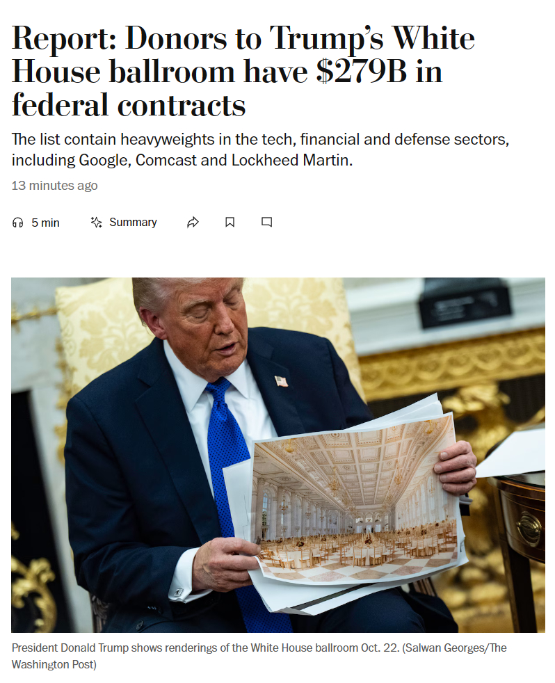 一文读懂美国。《华盛顿邮报》:为阿川建白宫舞厅出钱的捐赠者,一共拿到了2790亿美元的联邦合同。