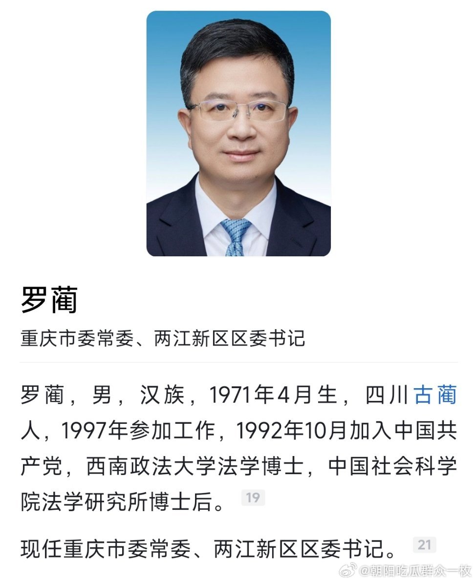 重庆市调整部分行政区划重庆部分行政区划调整,罗蔺任两江新区区委书记。
