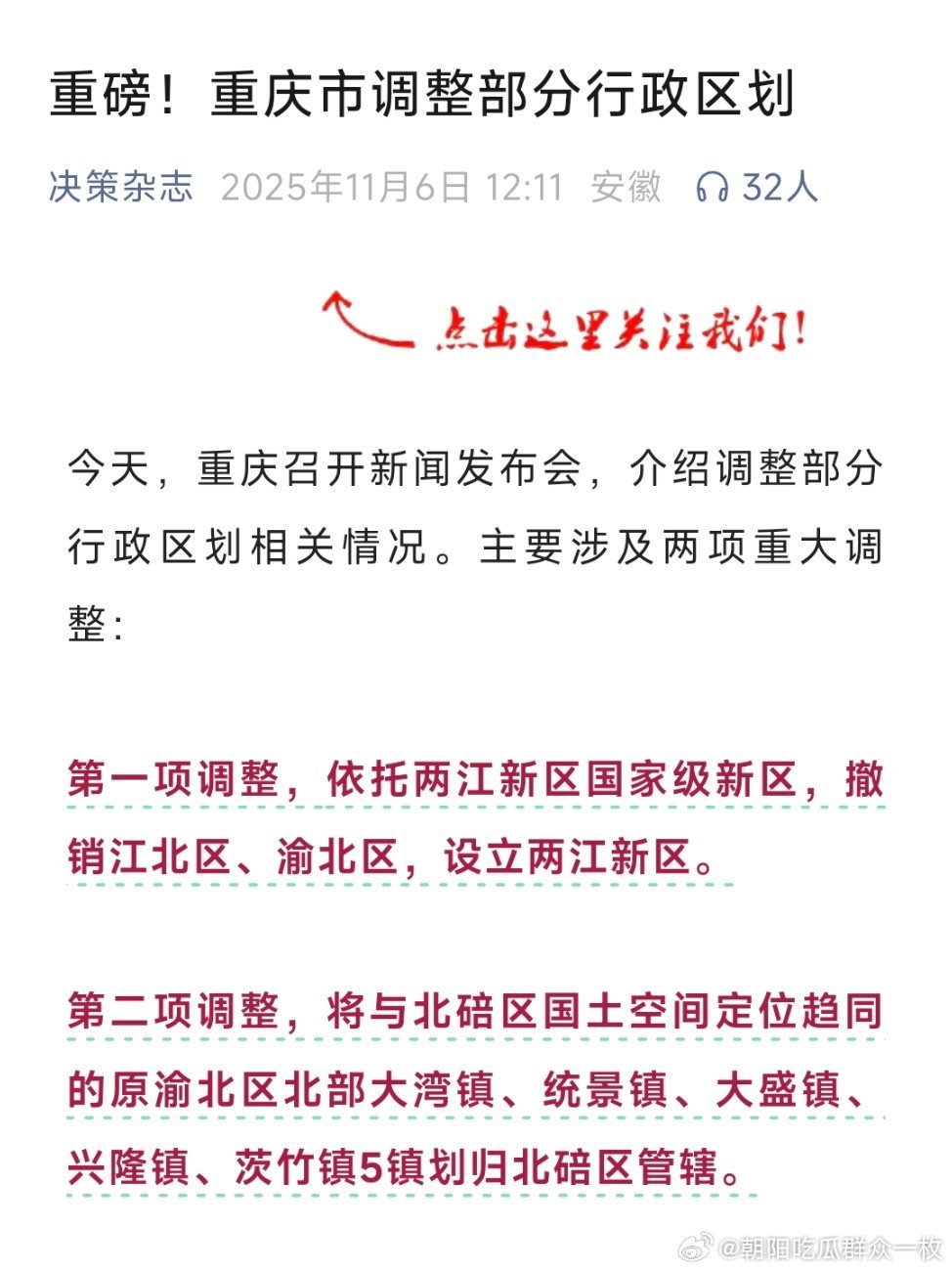 第一项调整,依托两江新区国家级新区,撤销江北区、渝北区,设立两江新区。