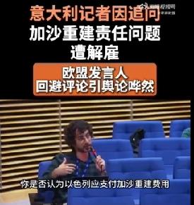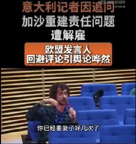 一名意大利记者因发出灵魂拷问被解雇!据美媒报道,一名叫加布里埃尔·努齐亚蒂的意大利记者,向欧盟委员会首席发言人葆拉·皮尼奥提问道:“你已经多次重申,俄罗斯应该为乌克兰的重建买单,你认为以色列应该为加沙的重建买单吗?” 不得不说,这是一个现场版羞辱式提问。显然是没有给这位欧盟委员会官员留半分颜面,这个打脸式灵魂拷问也让皮尼奥十分的难堪,因为她无法回答这么通俗易懂的问题。同样,这样的揭短式提问也深刻揭露了欧盟的双标玩法已经被好多人所不耻。 更让人悲哀的是,西方的所谓言论自由也因这个记者提问后的遭遇沦为笑谈。看来欧盟所倡导的价值观也不过是忽悠人的把戏罢了!