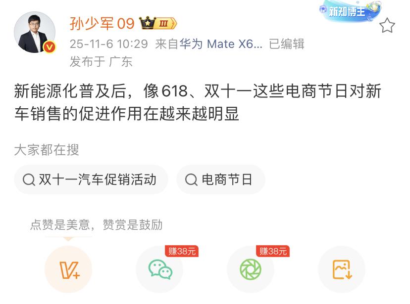 孙少军:新能源化普及后,像618、双十一这些电商节日对新车销售的促进作用在越来越明显! 别说卖车了,就是线下的超市,现在为了抢占双11也会推出类似的活动。 现在有些商家还是个策略是有些商品不挣钱,靠那些利润高的产品去卖钱。甚至有些线下门店,进店就会送你礼物,就是为了让你进店消费。