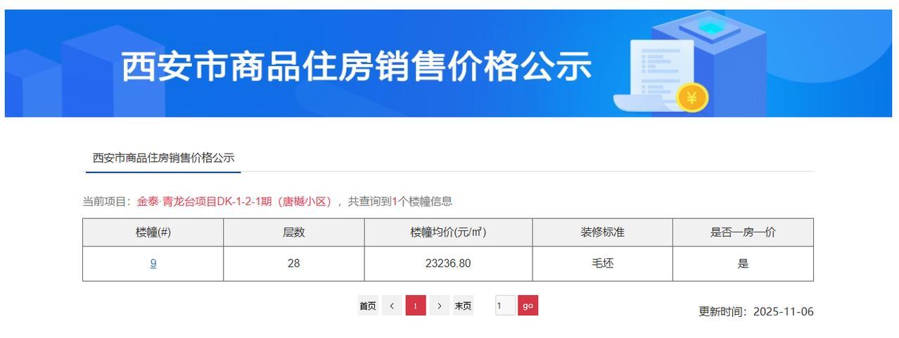 快讯!11月5日,西安住建局公示了雁塔区青龙寺板块“金泰·唐樾项目”新一批房源的价格! 本次价格公示,项目公示了9楼 一栋楼的价格,是一栋28层的高层,户型面积142.05㎡、125.32㎡、141.94㎡、143.28㎡、143.39㎡、126.08㎡、142.37㎡、142.48㎡、125.73㎡,楼栋均价为23236.80元/㎡,共84套毛坯房源。 金泰·唐樾项目位于西安市雁塔区青龙寺板块,雁翔路以东、青龙寺路以南、新安东街以西,占地面积约83亩,总建面约20万方,容积率2.5,绿化率40%,规划11栋住宅。 项目设置全龄段活动场域,包括儿童区、健身区、乒乓球桌、健康跑道等,满足不同年龄段居民的休闲需求,促进邻里互动。景观园林打造核心剧场、艺术荟廊、精致花园、禅意吧台等空间,提供沐浴阳光的社交场所,增强社区凝聚力。 配套上,项目西邻雁翔路,北接青龙路,东侧、南侧与规划道路相接,东北侧为雁塔区第一小学、雁塔第一中学,西侧为青龙寺遗址公园,西南角近邻西安地铁3号线、5号线换乘站青龙寺站。 周围还有西安铁一分校、武警陕西省总队医院(三甲)、陕西冶金医院、交大附小、曲江一小、交大附中等配套。