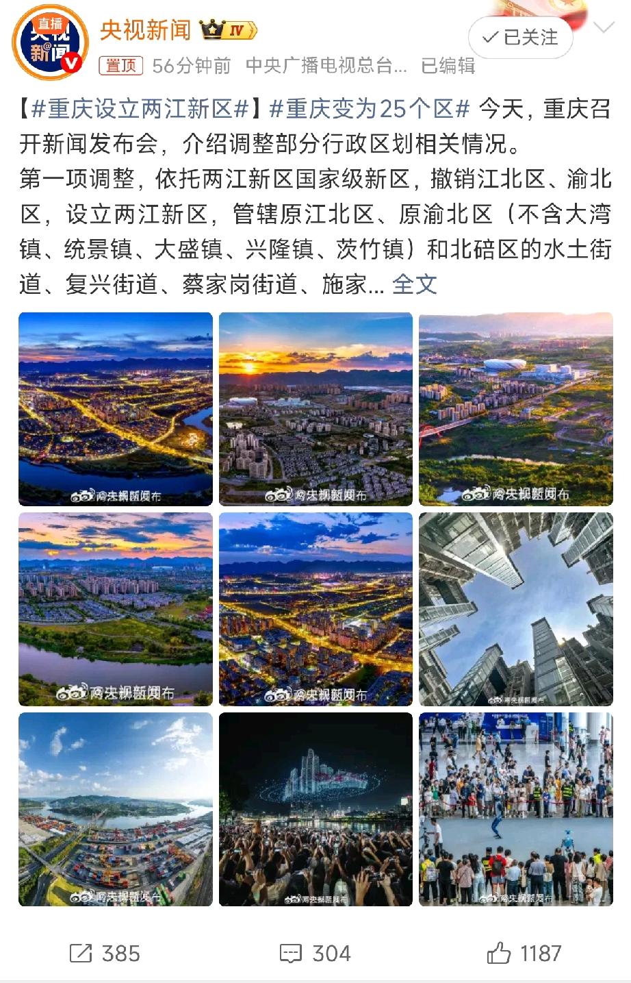 刚刚,重庆行政区划大调整尘埃落定。原江北区、渝北区正式合并,升级为两江新区。这一