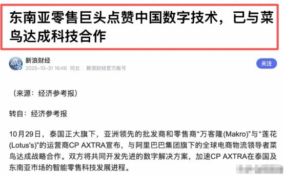 从投资中国到抄中国作业,时代彻底反转了,世界都开始向中国交学费。   这背后的变化,藏着一场跨越四十年的时代反转——曾经带着饲料和技术来中国“当老师”的正大集团,如今正捧着真金白银来学中国的科技“作业”。 故事得从1978年说起。   那年中国刚打开改革开放的大门,农民种地还靠天吃饭,养猪养鸡缺饲料、没技术,市场上肉蛋供应都紧张。正是这个时候,泰籍华人谢易初创办的正大集团,成了第一家敢来中国“吃螃蟹”的外资企业。   他们带着先进的饲料配方和养殖技术,在深圳、汕头等地建工厂、搞养殖,手把手教中国农民怎么科学养猪、怎么配饲料。当时正大带来的“全产业链农牧模式”,在中国人眼里简直是“黑科技”,不仅解决了不少地方的养殖难题,还带动了整个农牧行业的升级。   那会儿央视的《正大综艺》火遍全国,连带着“正大”这两个字,都成了“先进技术”的代名词。   谁能想到四十多年后,风水轮流转。2025年10月底,正大集团旗下掌管着万客隆、莲花等2700多家东南亚门店的零售巨头CPAXTRA,高调宣布和阿里巴巴菜鸟达成战略合作,要把中国的数字物流技术全套引进泰国。   这次正大要学的可不是简单的“手艺”,而是一套能让货跑得更快、更准、成本更低的复杂系统——从门店里的智能拣货包装,到运输中的路线优化,再到货架上的库存管理,全链条都要抄中国的作业。   泰国首富谢氏家族的第三代传人谢宇宸直接表态,这是和中国科技企业深度合作的开始,要靠中国技术提升国际竞争力。 正大这波操作,说白了是“痛点逼出来的选择”。   泰国商业部早就算过一笔账,当地物流成本占GDP的14%,比中国高出好几个百分点,而发达国家通常能控制在10%以下。随着东南亚电商越来越火,消费者催单催得紧,CPAXTRA旗下的超市光是靠人工拣货、电话调度车队,根本跟不上订单增长。   他们在全球找了一圈解决方案,最后发现只有中国的系统经受过真正的“实战考验”——菜鸟这套技术,是在每年双十一上亿订单的轰炸下迭代出来的,单日处理几千万包裹都不卡壳,这点正是东南亚市场急需的。   现在泰国门店里落地的iWMS智能拣货包装系统,就是最好的例子。以前店员拣货得拿着纸质清单挨个货架找,记错货、拿错量是常事,一天下来累得够呛效率还低。用上中国系统后,电子屏会精准显示货物位置、数量,扫码确认后自动生成包装清单,拣选效率直接提升140%。   再配上菜鸟的TMS运输管理系统,CPAXTRA自家的4000辆运输车跑起来更“聪明”了,系统能实时规划最优路线,避开拥堵不说,还能顺路拼单,大大降低了运输成本。   更厉害的是正在推进的AI货架陈列方案,机器能根据销量数据自动调整商品摆放位置,既能让顾客好拿,又能减少库存积压,这都是中国电商打了十几年价格战练出的“真功夫”。   这事儿往深了说,根本不是简单的“技术买卖”,而是中国从“技术输入国”变成“标准输出国”的缩影。当年正大来中国,给的是单一的饲料配方和养殖技术;现在中国给东南亚的,是经过市场验证的全套系统解决方案。   就连马来西亚东海岸铁路那条16公里长的东南亚第一长隧,也是中国企业用自主TBM技术啃下来的硬骨头,攻克了高地温、高水压的世界级难题,创下了马来西亚的工程纪录。 这种极致的效率要求,逼着企业必须把分拣、运输、仓储的每个环节都做到最优。就像练武功,平时在擂台上打千次万次,真到实战自然得心应手。中国的物流科技就是在这样的“实战擂台上”磨出来的,比起那些只靠理论设计的技术,自然更接地气、更好用。   更有意思的是,这波“抄中国作业”的热潮还在扩散。除了正大学物流,东南亚的电商平台在抄淘宝的直播带货模式,非洲的移动支付在抄支付宝的运营逻辑,连欧洲的一些新能源企业都在借鉴中国的产业链管理经验。   以前我们总说“向发达国家学习”,现在轮到世界向中国交学费了,这不是偶然,而是中国多年来在数字经济、实体经济领域持续投入的必然结果。 当年谢易初带着菜籽和技术闯荡南洋,没想到四代人之后,他的家族要靠中国的科技续写辉煌。   从1978年的饲料厂到2025年的智能系统,正大集团和中国的互动史,简直是一部浓缩的时代变迁史。这波反转告诉我们:真正的核心竞争力,从来不是靠垄断和炫耀,而是在解决实际问题中磨练出来的。当中国的技术能帮其他国家降成本、提效率时,自然会有人主动来“交学费”。   未来这种“中国教、世界学”的戏码只会越来越多。毕竟有双十一这样的“超级试炼场”,有菜鸟这样能把技术落地的企业,中国的科技输出还会有更多惊喜。   而那些曾经的“老师”们,放下身段抄作业也不是丢人的事——毕竟在发展的赛道上,谁能学到真东西,谁才能跑在前面。