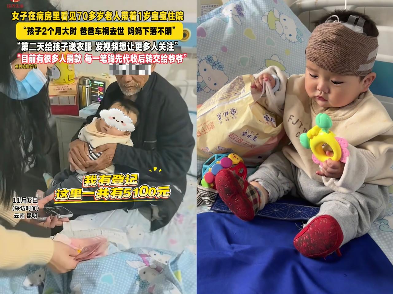 云南住院病房里, 一岁宝宝身边只有70多岁爷爷守着, 这画面让人揪心! 女子一问才知,孩子爸爸早出车祸走了,妈妈也狠心离开,只剩老人带着生病的小孙子艰难讨生活。 看着孩子脏旧的衣服、包着纱布的头,谁不心疼? 女子没犹豫,回家拿了自家孩子旧衣服,煮了热面,可她知道,自己力量有限。 于是,她把故事发到网上,没想到爱心如潮水般涌来! 无数人表示要帮忙,女子把钱换成现金交给老人,还拍视频记录,给好心人一个交代。 善行如暖阳,能融化生活里的冰霜。 老爷爷和宝宝的遭遇让人心酸,但幸好有这么多善良的人伸出援手。