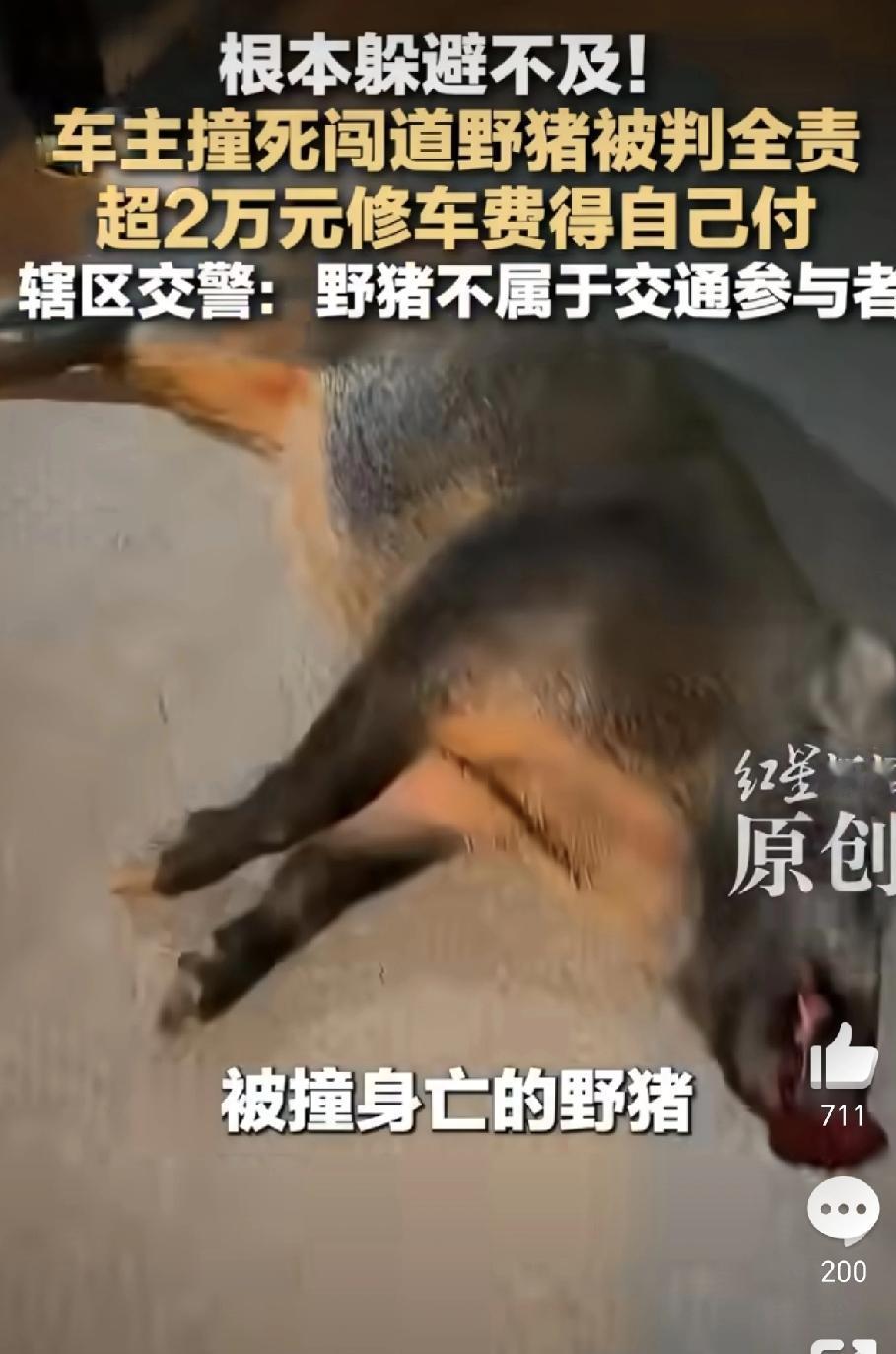特斯拉撞死突闯国道的野猪,修车费超2万元,车主全责,判车主全责。司机全神贯注驾驶,根本躲不开鬼探头似的动物。 判司机全责应该是为了走保险,否则2.3万修车费都🉐自己出。日前吉林曾发生女司机撞死黑熊事件,也是认定单方意外事故。 但是如果撞死熊猫、金丝猴不、东北虎这类国家一级保护动物就要小心谨慎操作,小心被追责。