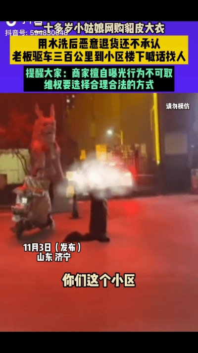 “专治白嫖党!”山东济宁,二十多岁小姑娘网购貂皮大衣,用水洗后恶意退货还死不承认!老板忍无可忍,驱车300多公里杀到对方小区楼下,手持扩音喇叭开启“人肉搜索”模式!”网友:这样的人真的很恶心,你穿了的衣服退回去卖给谁? 据河南广播电视台民生频道11月6日报道,这位老板娘是开网店的,专门卖貂皮大衣这类比较贵的衣服,前段时间,一个济宁的小姑娘在她店里下单,买了一件两千多的貂皮。 按理说,这是一笔正常的生意,但没过几天,麻烦就来了,小姑娘申请了退货退款,理由是不满意,老板娘也没多想,网购嘛,七天无理由退货是平台的规矩,退就退吧。 可等她收到退回来的快递,打开包裹一看,整个人都傻眼了,那件原本柔软顺滑的貂皮大衣,现在变得硬邦邦的,摸上去的手感就像一块劣质的塑料板,皮子都发僵了。 这衣服别说再卖给别人,就是白送,估计都没人愿意穿,老板娘心里跟明镜似的,貂皮这东西金贵,最怕的就是水洗,这件衣服百分之百是被人扔进洗衣机里给洗报废了。 她立刻拒绝了退款申请,想跟买家好好说道说道,可没想到,这个小姑娘看着年纪不大,对平台的规则却门儿清,她根本不跟老板娘正面沟通,直接找平台介入。 一来二去,经过一通让人看不懂的操作,平台竟然真的把两千多块钱退给了那个小姑娘,老板娘这下彻底懵了,货没了,钱也没了,手里就剩下一件报废的“塑料”大衣。 她不甘心啊,两千多块钱,对于一个小本经营的商家来说,可不是个小数目,这得卖多少件衣服才能赚回来?她开始尝试联系那个小姑娘,电话打过去,对方要么不接,要么接了就一口咬定,说收到的时候衣服就是这个样子的。 这种颠倒黑白的话让老板娘气得直哆嗦,这不是明摆着欺负人吗?她又去找平台申诉,提交了各种证据,但平台那边就像个机器人,来来回回就是那几句话,根本解决不了问题。 所有的路似乎都被堵死了,老板娘是越想越憋屈,难道就这么吃个哑巴亏,让这种不诚信的人逍遥法外?她咽不下这口气! 一股倔劲儿上来,她翻出了订单上的收货地址。 虽然地址不详细,但写明了是济宁的哪个小区,她下定决心,就算豁出去了,也要去当面问个明白!于是,她加满油,关了店门,一个人开车三百多公里,直奔那个陌生的小区。 到了小区门口,她还是抱着一丝希望,希望能通过正常沟通解决问题,可现实再次给了她一盆冷水,对方根本不接电话,人也见不着。 眼看着天色渐晚,几百公里的奔波换来的却是这样一个结果,老板娘心里的火“噌”地一下就窜上来了,她想,既然你不讲体面,那就别怪我不给你留面子了! 她从车里拿出了事先准备好的大喇叭,站在小区里就开始喊话:“你们小区有个二十多岁的小姑娘,从网上买了一件貂皮大衣,用洗衣机给洗报废了,还退回来给我,死不承认!我念一下手机号,是谁谁给我报一下名字……” 洪亮的声音在小区里回荡,立刻吸引了不少居民出来围观,这一喊,算是彻底把事情闹大了,老板娘自己也把视频发到了网上,她说自己就是要“悬赏找人”,不计成本也要追究到底。 她说,自己这趟维权,光油费就花了两百多,时间也耗进去好几天,但她不后悔,她要的已经不仅仅是那两千多块钱了,她要的是一个公道,一个说法。 这事在网上一传开,网友们也炸了锅,很多人都站在老板娘这边,觉得那个小姑娘的做法实在太过分了。 有人说:“支持商家!我买东西不合适,退回去的时候连包装袋都小心翼翼的,生怕弄坏了,这种把人家东西搞坏了还理直气壮退货的,真是缺德!” 还有人评论道:“商家能有底气开车几百公里去闹,手里肯定是握着铁证的,貂皮不能水洗这是常识,小姑娘自己不懂,犯了错就该承担后果,躲起来算什么本事?” 当然,也有人觉得老板娘在小区里用大喇叭喊话的方式有点极端,影响了其他无辜的业主,但更多的人表示理解,有网友说:“换位思考一下,如果你是商家,辛辛苦苦赚的钱被人这么耍无赖坑走了,平台和稀泥,对方玩消失,你能怎么办?这真是被逼到绝路上的无奈之举啊!” 是啊,如果不是走投无路,谁又愿意放下尊严,像个泼妇一样在大庭广众之下去嘶喊呢?这件事其实戳中了很多网购族的痛点。 那个原本为了保护消费者权益的“七天无理由退货”规则,在一些人手里, 却成了占便宜的工具,有人买衣服就为了穿几天拍个照,然后吊牌都不摘就退回去,更有甚者,把网店当成了自己的免费衣橱。 这些行为,消耗的是整个社会的信任成本,每一次看似聪明的“白嫖”,都在伤害那些诚信经营的商家,最终这些损失,还是会通过各种方式转嫁到我们所有消费者头上。 那个躲在屋里不敢露面的小姑娘,也许觉得自己钻了个规则的空子,占了天大的便宜,但她失去的,却是比那两千块钱宝贵得多的东西——诚信。 希望这件事能给所有人提个醒,规则是用来遵守的,而不是用来践踏的,别因为一点蝇头小利,就丢掉了做人最基本的底线。 信源:河南广播电视台民生频道2025-11-6