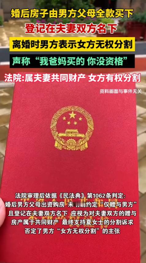 北京,一对夫妻离婚分财产,女方要求分房产遭拒,男方称,房子由父母全款购买,只是登记在夫妻双方名下,所以归其个人所有,前妻无权分割!律师:属于夫妻共同财产,女方有权要求分割! 据读嘉新闻11月5日报道,好家伙,这事儿闹得,真叫一个“婚前海誓山盟,离后寸土必争”! 事情是这样的,夏女士和她丈夫结婚两年,日子过不下去了,决定一拍两散,可到了分财产这一步,俩人卡住了。 问题的核心就是那套婚房,这房子是结婚后,公公婆婆掏空积蓄,全款给小两口买的,但关键在于,房产证上清清楚楚写着夏女士和她丈夫两个人的名字。 现在要离婚了,男方不干了,觉得这房子是他家的钱买的,理所当然就该是他一个人的,他振振有词地说,这钱是他爸妈一辈子的血汗钱,这房子就该是他个人的婚前财产,只是暂时登记在了俩人名下而已。 夏女士一听这话,气得浑身发抖,她觉得男方简直是在“耍流氓”,结婚这两年,她为了这个家付出了多少?洗衣做饭、打扫卫生,家里上上下下、里里外外,哪样不是她操持的? 就连每个月的水电费、燃气费、物业费,也都是她省吃俭用交的,她觉得,就算自己没出买房的钱,这两年的辛苦付出,难道就一文不值吗?房产证上白纸黑字写着她的名字,这难道是写着玩的? 两个人谁也说服不了谁,吵得面红耳赤,昔日的夫妻情分在房子面前显得那么脆弱,夏女士越想越憋屈,一气之下,直接找了律师咨询。 她心里也没底,毕竟房子确实是公婆出的钱,没想到,律师听完她的叙述,直接给她吃了一颗定心丸。 律师告诉她,别怕,这房子你不仅有份,而且还能因为这两年的家务劳动,要求额外的经济补偿,这话一出,网上可就炸了锅,不少网友觉得男方太不地道了,纷纷替夏女士鸣不平。 有位网友说得特别实在:“当初登记名字的时候怎么不说只写自己的?那时候想着用夫妻共同财产的名义显得自己大方,现在离婚了就翻脸不认账,这不是典型的又当又立吗?” 其实,男方的想法在现实生活中并不少见,很多父母出资给子女买房,都觉得钱是自己家出的,房子自然就是自己家的。 可他们忽略了一个顶顶重要的事情:法律是怎么认定的,咱们国家《民法典》里写得明明白白,不动产这东西,看的是登记。 房产证上写了谁的名字,这房子在法律上就是谁的,当时男方父母全款买房,在办房产证的时候,如果只写了儿子的名字,那这房子毫无疑问就是儿子的个人财产,夏女士确实没份。 或者,他们可以在赠与的时候,签一个书面协议,明确表示这笔钱或者这套房子,只赠与给儿子一个人,跟儿媳妇没关系,再去公证一下,那也行。 可他们偏偏选择了把两个人的名字都写上,在法律上,这种行为就被看作是父母对夫妻双方的共同赠与,除非有相反的证据,否则这套房子就是铁板钉钉的夫妻共同财产。 男方现在拿“我爸妈出的钱”来说事,在法律面前是站不住脚的,这就像你请朋友吃饭,菜都点上桌了,吃完了你又说这顿饭钱只算你一个人的,朋友吃的得自己掏钱,这不讲道理嘛。 当初登记名字的时候,就是一种承诺和认可,现在想反悔,晚了,再说说夏女士的家务劳动,以前很多人觉得,女人在家做家务是天经地义的,是“分内之事”,但现在法律不这么看了。 《民法典》里专门有个“家务劳动补偿”制度,说的是,夫妻一方因为照顾孩子、老人,或者协助另一方工作,承担了更多的家庭义务,离婚的时候,就有权利要求另一方给补偿。 夏女士这两年包揽了全部家务,还自己掏钱交各种生活杂费,这些付出虽然不像上班挣钱那样直接,但它实实在在地为这个家庭创造了价值,保证了家庭的正常运转,也让男方可以没有后顾之忧地在外面工作。 如果把这些家务活换算成市场价,请个保姆两年下来也得十几万,这笔账不能不算,所以,法律支持她要求补偿,这是对她付出的承认和尊重,也是一种公平的体现。 说到底,婚姻不仅仅是感情,也是一份契约,既然选择了走进婚姻,就要遵守规则,财产的登记、协议的签订,都是白纸黑字的约定。 不能在享受权利的时候心安理得,到了要承担义务的时候就想赖账,男方如果一开始就想把房子牢牢抓在自己手里,就应该在结婚前把这些事都弄明白,而不是等到离婚的时候,才来扯皮耍赖,试图用亲情伦理来对抗法律规定。 这件事情也给所有准备结婚或者给子女买房的父母提了个醒:钱的事情,一定要提前说清楚,做好规划。 是只给儿子,还是给小两口,不同的选择对应不同的法律后果,别因为一时的含糊或者爱面子,给将来的生活埋下这么大的一个雷。 缘分尽了,好聚好散是最好的结局,为了房子撕破脸皮,不仅伤害了曾经的感情,也让自己显得十分难堪。 信源:读嘉新闻2025-11-5——北京男子离婚拒分房:“我爸妈买的,你没资格!"公婆全款买房登记双方名下,法院判女方有权分割