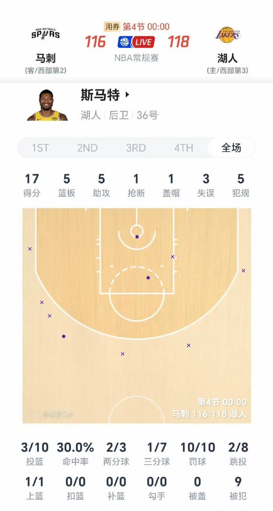 118-116!又是一场经典的湖人式赢球,湖人5连胜。最后0.4秒差点让马刺补篮绝平。 以这样一种方式击败西部第二马刺,湖人强得离谱。西部可能只有雷霆才能扳手腕。 湖人升至西部第二,又是去年熟悉的排名。斯玛特今天无处不在,尤其是比赛最后强行给比赛加难度。 休赛期雷迪克是怎么训练这帮人的?