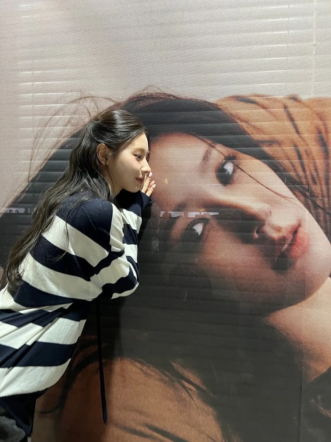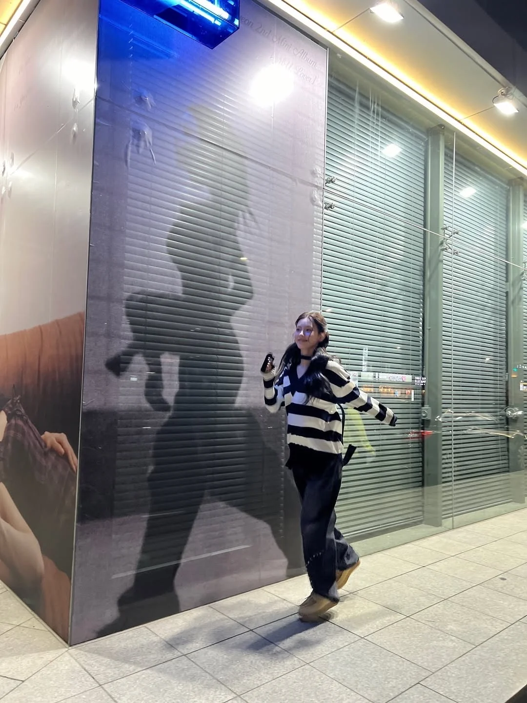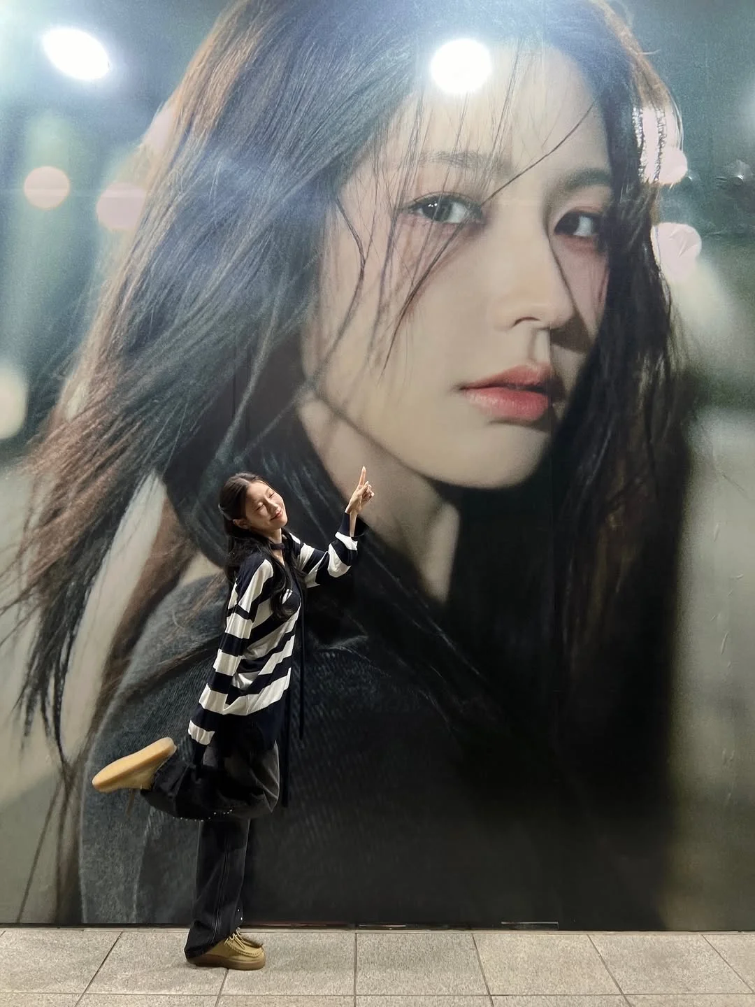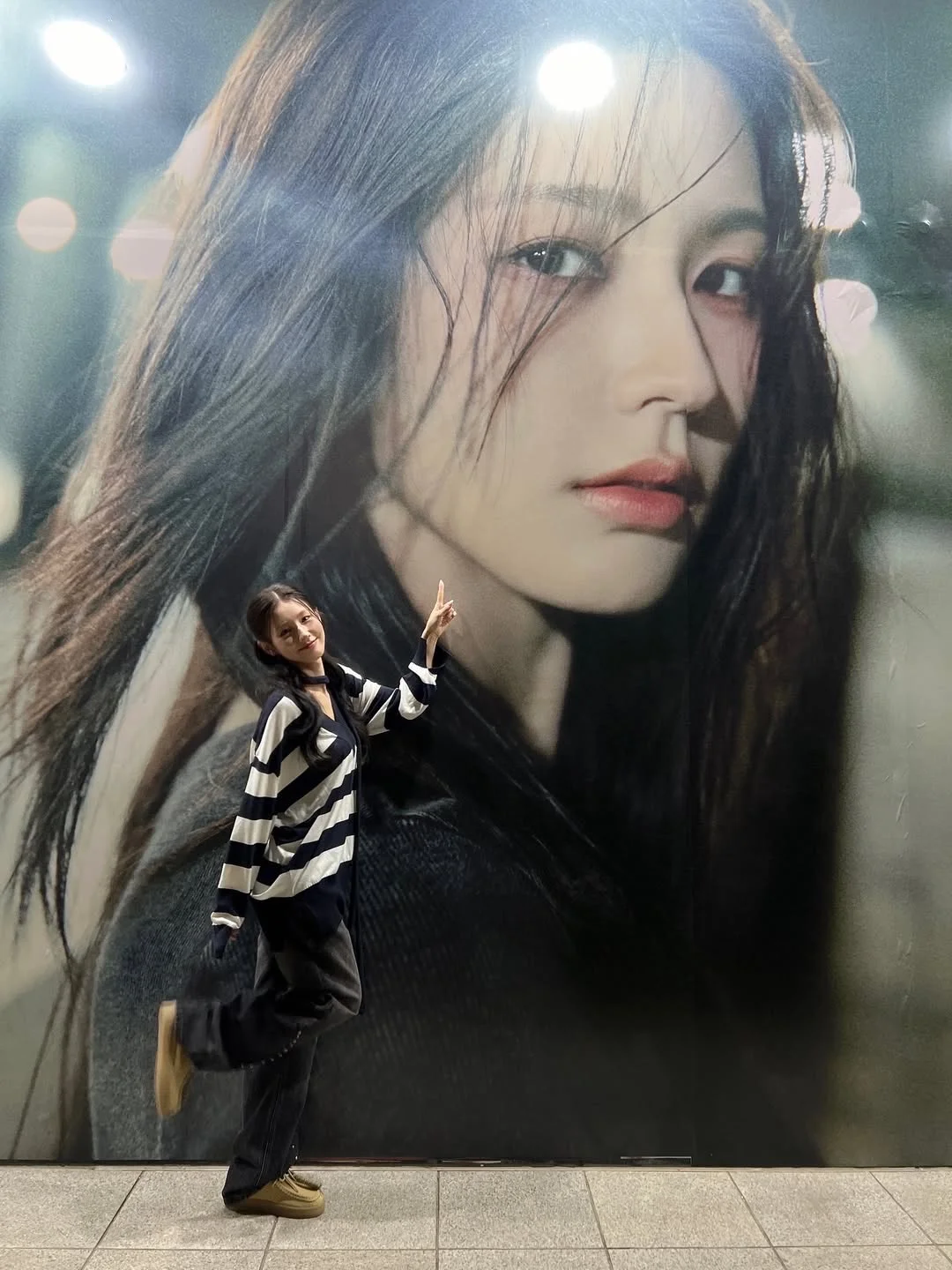 赵美延今日打卡自己的海报,条纹配牛仔裤与袋鼠鞋的松弛与随性,硬照私服都可美! 赵美延