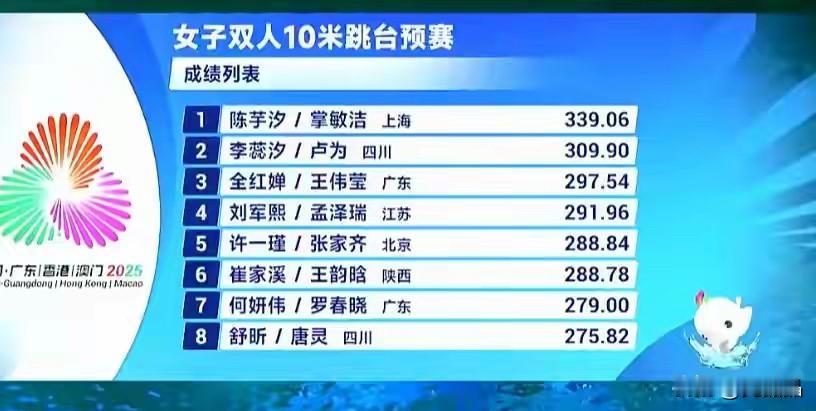 陈芋汐太强啦!陈芋汐/掌敏洁全运会女子双人十米跳台预赛领先第一,成功晋级决赛。 预赛结果:陈芋汐/掌敏结以339.06分领先第一,卢为/李蕊汐以309.09分排名第二,全红婵/王伟莹以297.54分排名第三。 陈芋汐组合稳定发挥,预赛以高出30分的优势领先第一。全红婵和王伟莹组合稍有落后,不知是因为婵宝的旧伤影响,还是和王伟莹搭档默契不够,不过幸好进入了决赛。 高手过招如神仙打架,下午18点的决赛,你们期待谁夺冠呢? 全红婵陈芋汐张家齐上演神仙对决陈芋汐,全红婵