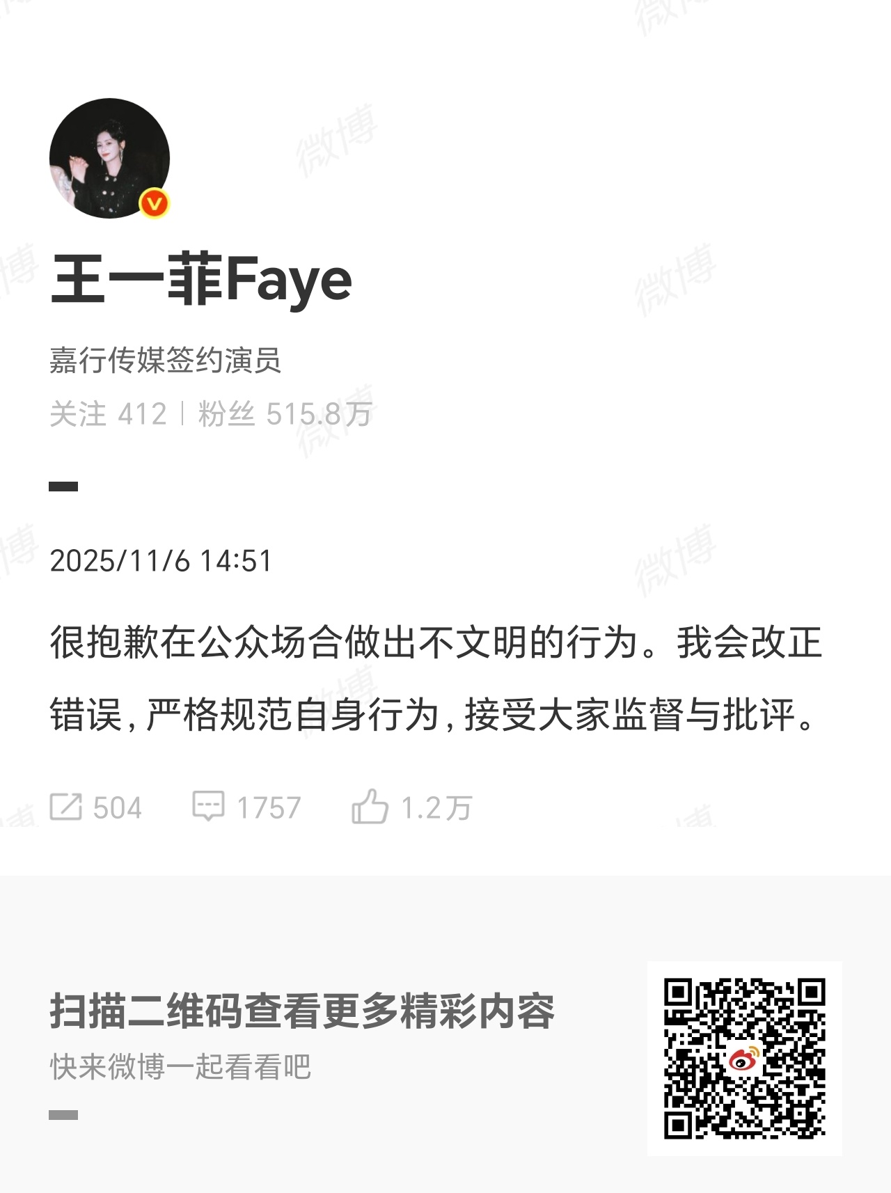 【#王一菲致歉#】11月6日, #王一菲抽烟#登上热搜引发热议。随后,回应称,“很抱歉在公众场合做出不文明的行为。我会改正错误,严格规范自身行为,接受大家监督与批评。”