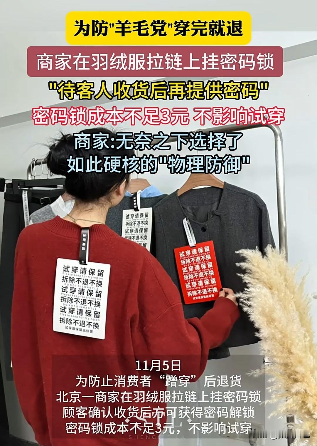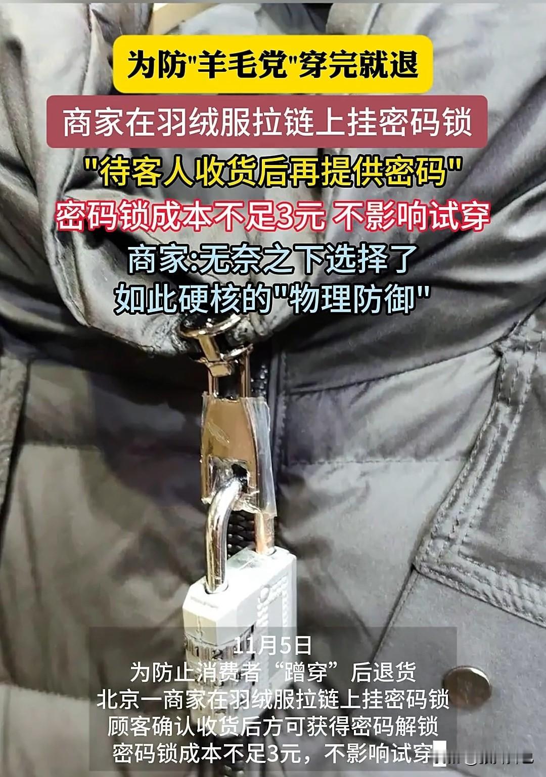 煞费苦心:为防“羊毛党”蹭穿完后退货,商家在羽绒服拉链上挂密码锁:客人收货后提供密码! 近日,北京有一商家老板无奈吐槽:蹭穿的人太多了,可我这是羽绒服,不是便宜的T恤呀。无奈之下,商家采取了在羽绒服拉链上挂密码锁的方式,等顾客确认收货后方可获得密码锁密码。 因为此前想了很多办法,也没太多好方式来防止这种事情发生,这密码锁成本才不到三块,挂上去也不影响客人试穿,但穿出门总会让人有点心理负担,可以说是无奈之下的无奈之举吧。 商家说以前是采取挂巨型吊牌的方式 ,但效果不佳,成本反而不低。羊毛党们蹭穿依然故我。现在这种硬核的物理防御,总算是起了一点效果了。 其实对于我们这些老实的消费者来说,是很支持商家这样做的,不然总担心哪天自己就买到了别人穿后退过的货了,买个二手衣服心里总有点膈应不是 ? 如果仅仅是穿后退的还好,万一试穿的人有啥病导致自己也染上了,岂不是哭都哭不出来? 其实这事要解决,一个商家要把质量提上去,一定不要做AB款的衣服,顾客拿到货也开心。二个是顾客也不要老存着穿两天就无理由退货的心态,谁赚钱都不容易不是? 难怪有时买衣服,总觉得衣服不够新呢,原来总有那么一些人喜欢蹭穿啊,走在路上那吊牌不咯皮肤嘛? 支持硬核密码锁,拒绝买到二手衣服!