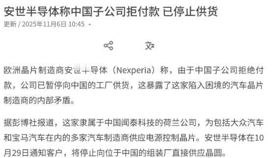 面对我们的警告,荷兰拒不让步!荷兰安世宣布,停止对中国安世供应晶圆。在我们商务部点名谴责荷兰政府不当干预安世半导体内部事务,不顾中方合理诉求,升级全球供应链危机,并警告荷方应承担全部责任之后,荷兰安世出来回应了。11月5日,荷兰安世声称,由于中国子公司拒绝付款,公司已暂停向中国的工厂供货。 荷兰安世倒打一耙声称,中国的实体已不再按照既定的公司治理框架运作,并且无视全球管理层的指示。安世半导体指控中国子公司称,其“擅自”使用了安世半导体中国实体的企业印章。 很显然在我们警告之后,荷兰方面态度没有任何改正。不仅宣布停止供应晶圆,还对我们进行指控,态度非常的恶劣,完全没有一点展现解决问题的态度。 这说法根本站不住脚,安世中国很快就拿出了证据反击,他们11月2日发布公告说,荷兰安世所谓的“拒付款”纯属恶意抹黑。安世中国不仅没有违约,反而荷兰方面还欠着东莞封测厂10亿元人民币的货款没给。两边各说各的理,明眼人一看就知道,这根本不是简单的商业付款纠纷。 事情得从更早的时候说起,安世半导体本来是中国闻泰科技在2019年花340亿买下的全资子公司,算是中国半导体国际化的标杆案例。这家公司在小信号二极管领域是全球第一,汽车电子里大量用它的芯片。 可到了今年9月底,荷兰政府突然出手,用了个1952年就有但从没启用过的《物资供应法》,以“国家安全”为由接管了安世半导体。他们冻结了荷兰境内的资产股权,还规定未来一年公司重大决策都得荷兰政府批准。 荷兰政府这步操作,背后明显有美国的影子。商务部后来披露,荷兰和美国早就在沟通“穿透规则”,美国还要求荷兰换掉安世的中方CEO、调整治理结构,这样才能避免被“穿透规则”制裁。 说白了,荷兰这是在帮美国打压中国半导体产业,所谓的“公司治理问题”只是个借口。 中方一开始就没坐视不管,商务部10月就谴责荷兰政府干预企业内部事务,11月1日还主动宣布对符合条件的出口给豁免,想推动恢复供货,态度够诚意了。可荷兰方面完全不领情,10月26日就单方面停了对东莞工厂的晶圆供应,11月5日又出来倒打一耙。 他们可能忘了,安世半导体70%到80%的产能都在中国,东莞工厂一年能出500亿件产品,80%的终端出货都在中国大陆。这一断供,最先慌的其实是全球的汽车厂商。安世的芯片是基础元器件,汽车电子离不开它,欧美日车企都已经在警告可能面临芯片短缺、影响生产了。荷兰安世拿供应链当筹码,最后只会砸自己的招牌。 更有意思的是荷兰安世说停供,安世中国却一点不慌。他们公告里说,现在的成品和在制品库存很充足,撑到年底甚至更久都没问题。 而且他们已经在验证新的晶圆产能,明年就能无缝衔接上订单需求。这一下就把荷兰安世的底牌看透了——你断供没关系,我们早有准备,反倒是你得担心丢了中国市场。 欧盟其实也不想把事情闹大,欧盟委员会的贸易委员11月3日还说,安世问题的谈判有进展,这是恢复供应链的关键。 可荷兰政府就是铁了心跟着美国走,完全不顾中欧经贸大局。他们可能没算过这笔账:干预中企投资,破坏的是荷兰自己的营商环境。以后谁还敢放心在荷兰做生意? 现在局势很明朗了,荷兰安世想靠停供施压,根本达不到目的。安世中国有库存有预案,丢不了客户。反倒是荷兰政府的干预行为,不仅让全球半导体供应链更动荡,还暴露了自己被美国绑架的事实。商务部说得很清楚,这事的责任全在荷方。 要是荷兰继续一意孤行,最后吃亏的只会是他们自己。安世半导体的市场份额丢了容易捡回来难,荷兰的营商信誉也会受影响。希望他们能早点想明白,别再跟着美国蹚浑水,赶紧坐下来好好解决问题才是正途。毕竟供应链稳定不是小事,真闹到不可收拾的地步,谁都没好处。