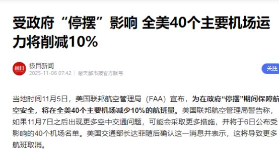 由于无法发放空管人员的工资,美国交通部宣布,从当地时间周五(11月7日)开始,美国40个主要机场将强制削减10%的运力。   这是美国政府关门闹剧带来的又一个恶果!政府停摆致空管人员薪资无着,交通部竟无奈宣布40个主要机场削减10%的航班。   这轮联邦政府停摆已经撑到第36天了,直接打破了之前的最长纪录。国会参议院都试了14次推进临时拨款法案,结果每次都卡在60票的通过门槛上。   两党还在互相甩锅,民主党骂共和党不顾民生,共和党指责民主党玩政治把戏,没人真正关心普通人的出行问题。   1.3万名空中交通管制员从10月起就没拿到过全额工资。这些人本来就是"必要人员",就算政府关门也得上班,可连基本薪水都没着落。   更糟的是停摆前空管系统就缺至少3000人,不少人早就在超时工作。现在拿不到钱,请假的人越来越多,纽约地区近90%的空管都没到岗。   空管们被逼得没法,只能想办法自救。不少人下班后开网约车、送外卖,还有人去餐厅当服务员、周末做家教。全国空中交通管理人员协会主席尼克·丹尼尔斯说,现在已经有几百人在打零工,过阵子可能会涨到几千人。刚入职的年轻人最惨,没存款还得还房贷,只能到处打听哪里能申请无息贷款、哪家机构在捐赠食品。   心思都被生活压力分走了,工作时自然没法全神贯注,安全风险跟着往上飙。交通部长达菲都承认,空管人员的压力已经到了"不可接受的程度"。   11月2日那天,全美就有近4300架次航班延误,550多架次直接取消。10月31日更夸张,延误航班超过5600架次,联邦航空局都直言,这是停摆以来影响最广的一次混乱。   联邦航空管理局局长贝德福德直接说了,从事这行35年,头一回遇到要靠减航班保安全的情况。交通部只能在11月5日正式宣布,11月7日起强制削减40个主要机场的运力。他们当晚就找航空公司开会,商量具体怎么减航班,连太空发射和小型飞机飞行都要受限。   这40个机场的名单6号才会公布,但光想也知道,纽约肯尼迪、达拉斯那些枢纽机场肯定跑不了。运力砍10%可不是小数目,意味着每天要少上千架次航班,普通人买票只会更难。阿拉斯加那些偏远地区更惨,政府的航空补贴断了,航空公司只能涨机票钱,不然根本撑不下去。   更让人揪心的是感恩节假期就在月底,副总统万斯已经警告了,要是停摆持续到那时候,航空交通可能会面临"灾难"。达菲说得更直白,到时候说不定得直接关闭部分空域,因为"根本无法控制局面"。美国旅游协会急得不行,专门写信给国会领导人,就怕假日旺季出大问题。   特朗普之前想让参议院废除"冗长辩论"程序,这样不用60票也能过法案,结果连自己党派的人都反对。共和党资深参议员麦康奈尔说,改了规则将来民主党掌权会更麻烦。两党就这么耗着,把民生当筹码。   盖洛普民调显示,近八成美国人都不认可国会的工作。布鲁金斯学会的专家更直接,说全世界都看着美国不会治理自己。毕竟过去45年里,美国政府已经停摆15次了,每次都是党争闹的,最后买单的全是普通民众。空管们没工资还要扛安全责任,旅客们被迫忍受延误涨价,这场闹剧真不知道还要演到什么时候。   来源:极目新闻 【受政府“停摆”影响 全美40个主要机场运力将削减10%】