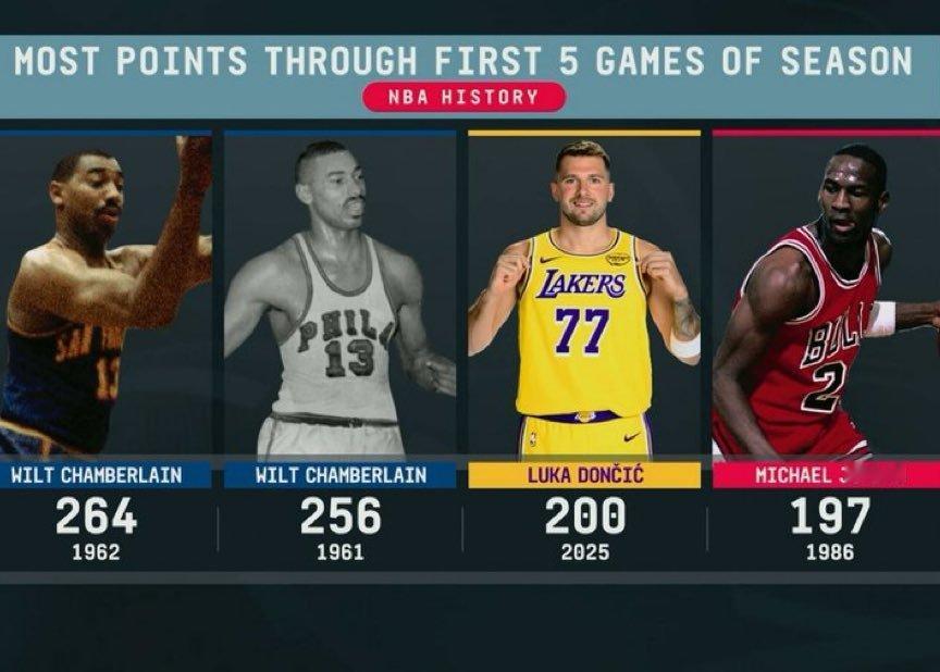 赛季前五场比赛,东契奇已经200分,超越乔丹历史第四。东契奇