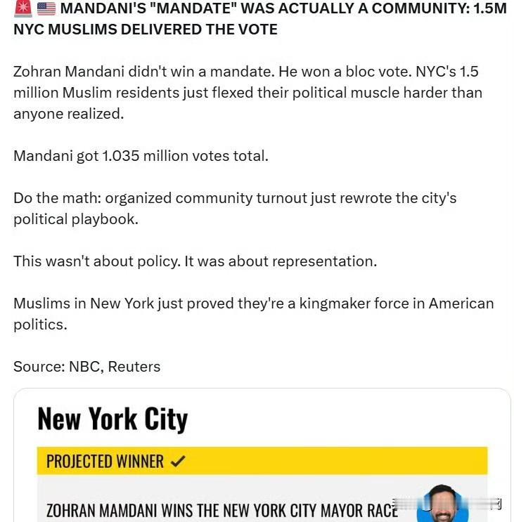 路透:佐兰·曼达尼并没有赢得真正的授权,他赢得的是一个选民集团的支持。 曼达尼的“授权”实际上是一个社区行为:150万纽约穆斯林交出了选票 纽约市150万穆斯林居民展示了比任何人预料的都更强大的政治影响力。 曼达尼总共获得了103.5万票。 有组织的社区投票行为,彻底改写了这座城市的政冶游戏规则。 这不是关于政策,而是关于代表权。 纽约的穆斯林刚刚证明,他们在美国政冶中是一股决定性力量。