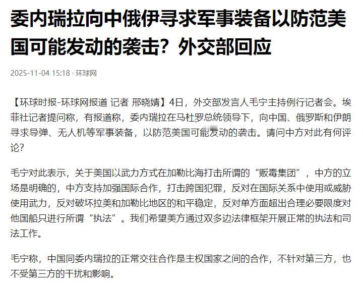 路透社爆料炸锅了:我国没拒绝委内瑞拉买中制防空装备的请求!   消息一传开,那些盯着中委合作的外国媒体都坐不住了,尤其是美国,估计又要扯着“地区稳定”的幌子说三道四。但这次咱们中方态度特明确:主权国家之间做买卖,天经地义,谁也管不着。   11月4号外交部开例行记者会,毛宁把话讲得明明白白:中国和委内瑞拉正常的合作往来,是两个主权国家的事儿,不针对任何第三方,更不怕别人在旁边指手画脚。这话可不是随口说的,你瞅瞅委内瑞拉现在的处境就知道,人家买装备纯粹是为了保命,跟主动挑事半毛钱关系都没有。   谁都清楚,最近美国把委内瑞拉逼得快喘不过气了。借着“缉毒”的名头,美军把军舰、轰炸机全怼到委国门口了。从9月到现在,光在加勒比海域就搞了至少6次军事行动,嘴上说击沉“运毒船”,实际上还集结了1万名士兵、8艘军舰,连核动力潜艇都派来了。   B-52轰炸机就在委内瑞拉海岸线边上绕圈,特种部队也在附近搞演习,这架势明摆着是施压。更过分的是,美国还掏出5000万美元悬赏马杜罗总统,甚至偷偷授权中情局在委内瑞拉搞秘密行动。换作任何一个国家,被这么步步紧逼,都得赶紧把“盾牌”备牢实了。   别听外面瞎猜,委内瑞拉要的不是能主动打人的导弹,全是用来防身的家伙事儿。雷达探测系统就是“千里眼”,能提前瞅见美军的战机、军舰往哪儿动;无人机帮着巡查海岸线,防止有人偷偷摸过来搞突袭;信号干扰设备更是“断联神器”,能让敌方的侦察和指挥信号全失灵。这些装备每一样都戳在委内瑞拉的安全痛点上,从头到尾没一件是用来主动挑事的。   有人可能会问,跟委内瑞拉做这笔生意,就不怕美国施压吗?毛宁的表态早给了答案:不怕。你想啊,美国自己才是全球最大的军火贩子,每年靠卖武器赚得腰包都鼓成球了,动不动就把先进战机、导弹卖给别的国家。怎么到了委内瑞拉买几样防身的装备这儿,就成了“威胁地区稳定”?这种双重标准的套路,国际上谁没看明白,早就看腻了。
