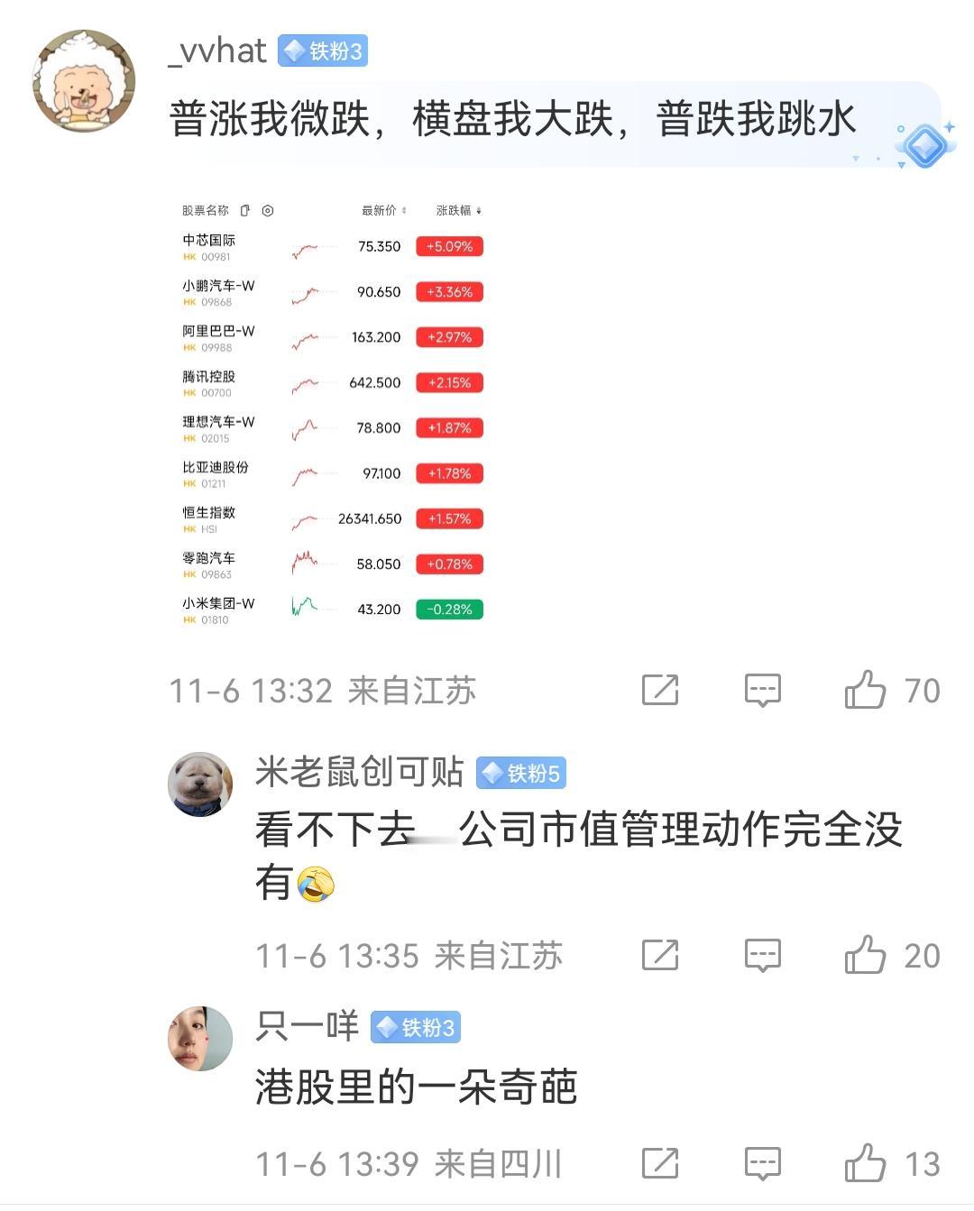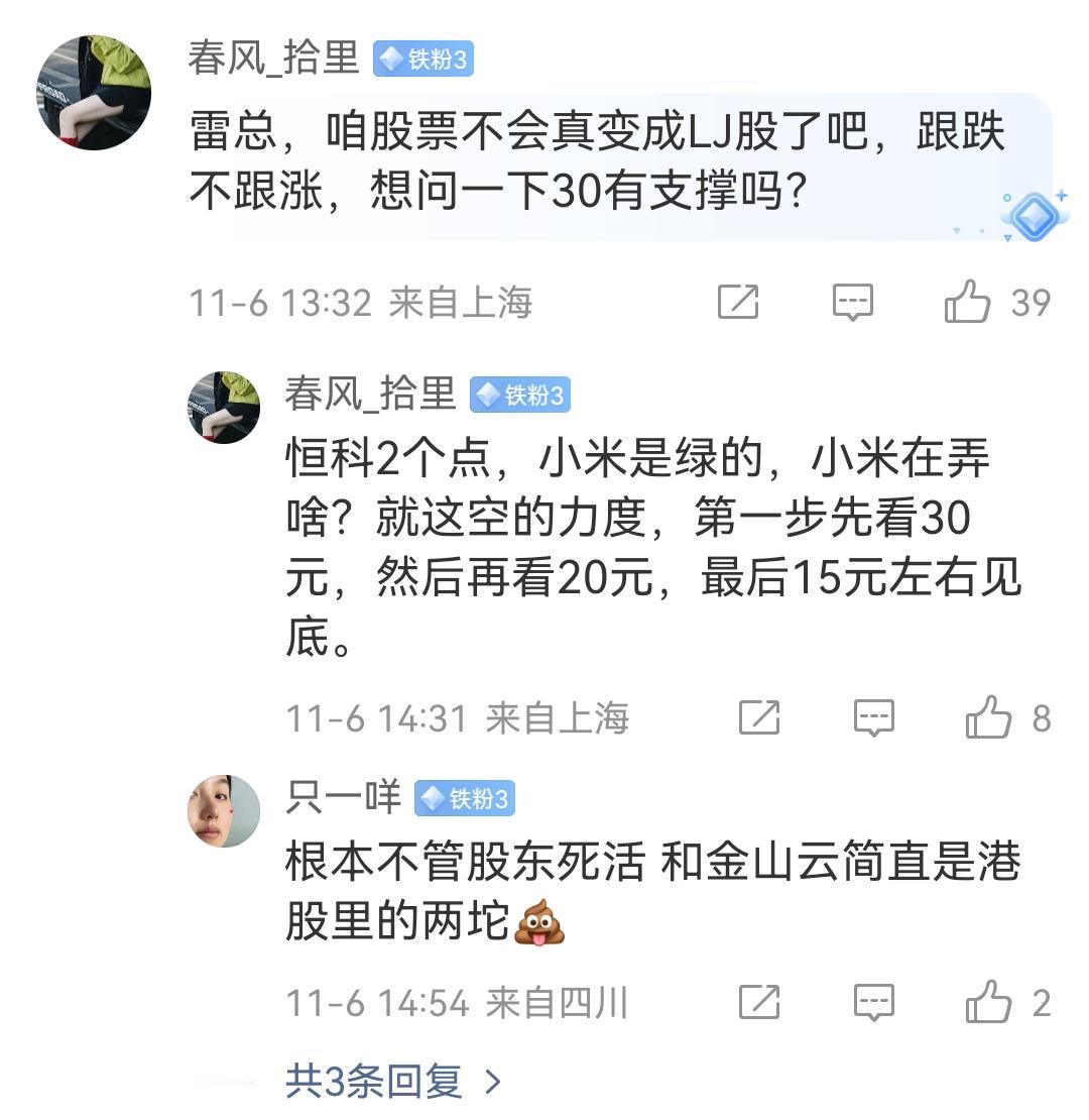雷军:当全身丹宁遇K90ProMax丹宁色,不止是手机,更是“握”在手里的潮流。 网友: 小米公司的市值怎么一直在掉? 最近雷军发布的内容里面大家也不是全部都是赞美执勤的,现在也关心一点比较实际的东西,比如为什么其他公司的股价都在涨,而唯独小米的股价在跌。 小米已经微跌一个多月了,大家都希望小米公司能够发布更重磅的消息来提升一下股价,稳定一下股东的信心。 各位是怎么看的?欢迎评论区留言。