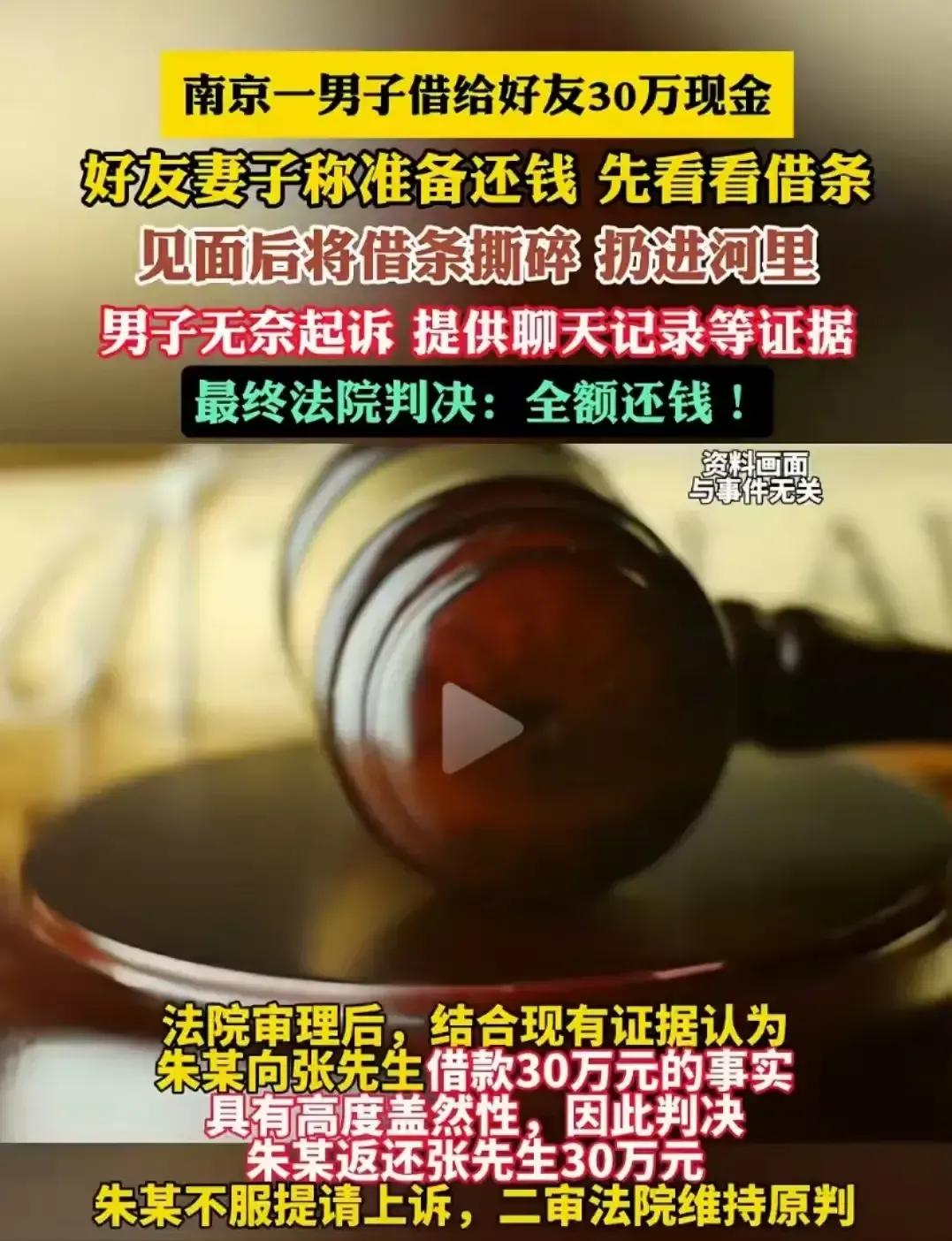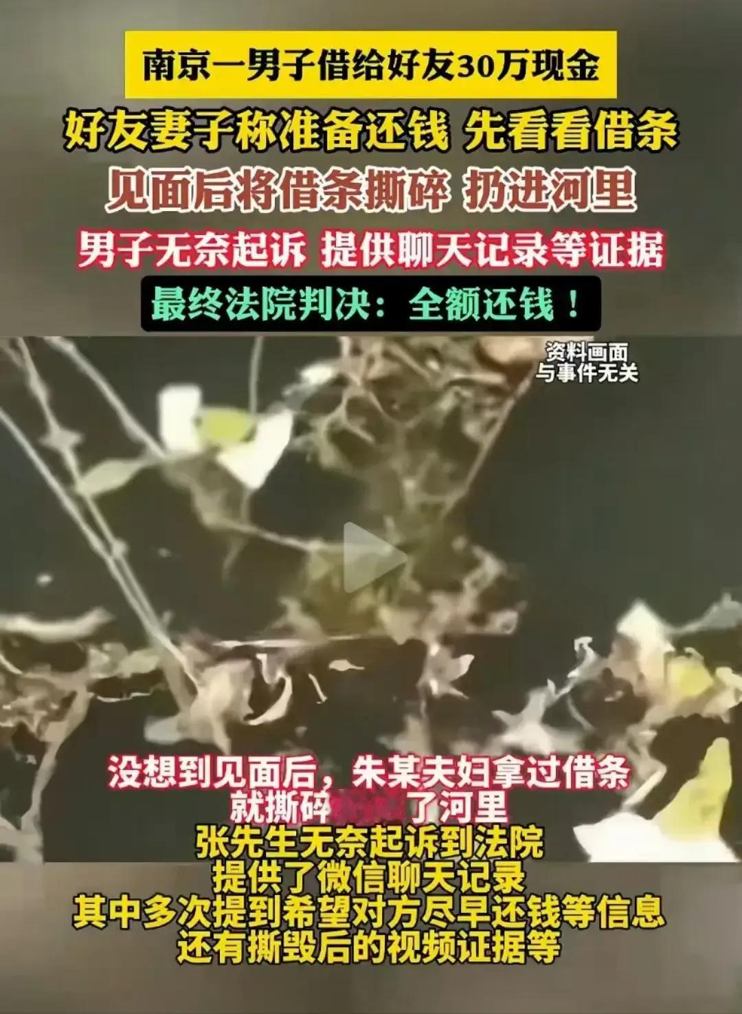 人心险恶!南京icon一男子借给好友30万现金,万万没想到好友妻子称准备还钱,但要先看看借条,趁机将借条撕碎扔进河里!男子无奈起诉,而法院的判决是公正的。这起事件不仅引发了公众的愤怒,更是对信任与背叛的深刻反思。 在这个快节奏的社会中,人与人之间的信任是多么脆弱。原本以为是朋友之间的相互扶持,却在金钱面前显得如此不堪一击。男子的善良与信任,竟然被好友的妻子利用,撕毁借条的行为不仅是对金钱的蔑视,更是对友情的无情践踏。这样的事情,让我们不禁想问:在利益面前,友情到底有多脆弱? 随着事件的发酵,网友们纷纷表达自己的看法。有的人感到愤怒,认为这是对信任的极大背叛;也有人感到无奈,认为在金钱面前,许多人的良知和道德都被抛弃。毕竟,借钱本是朋友之间的信任交易,但当一方选择了背叛,另一方又该如何自处? 然而,法院的判决为这一事件带来了希望的曙光。尽管借条被撕毁,法官依然认定男子的权益应当得到保护,最终判决他获得了应有的赔偿。这一判决不仅是对法律的坚守,更是对正义的捍卫。或许在这个充满挑战的社会中,我们依然能够依靠法律来维护自己的权益,找到属于自己的那份公正。 但这个事件不仅仅是一起简单的借贷纠纷,更是对人性、友情与道德的一次深刻拷问。在追求物质的同时,我们是否也在无形中失去了对人性的信任?在这个物欲横流的时代,重建人与人之间的信任,成为了我们每个人都需要面对的课题。 你是否也曾经历过类似的信任危机?在生活的某个角落,是否也曾因为信任而受伤?欢迎在评论区分享你的故事,让我们共同探讨这个值得深思的话题。正是这些经历,让我们在复杂的人际关系中,更加珍惜那些真正值得信赖的人。毕竟,信任如同一张脆弱的网,只有小心呵护,才能让它在风雨中依然坚韧不拔。