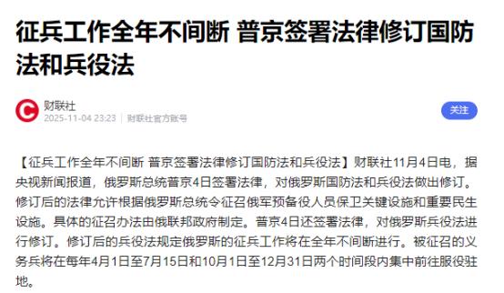 俄罗斯总统普京宣布了   2025年11月4日,俄罗斯总统普京签署了一项重磅法律,正式修订国防法与兵役法,宣布俄罗斯征兵工作将全年不间断进行,并允许征召预备役人员保卫关键设施。   从2026年1月1日起,全年征兵、不再休息,200万预备役随时待命。这不是简单的制度调整,更像是俄罗斯对当前乃至未来安全形势的“提前下注”。   大家能感觉到,俄罗斯周边的安全弦早绷得紧紧的。北约东翼一直在加军备,法国的“阵风”战机、德国的“台风”战机都往波兰、立陶宛这些地方挪,荷兰还搬去了“爱国者”防空系统。   美国更打算在2025年底前,把欧洲和土耳其的200枚核弹头换成高精度的新炸弹。这些动作堆在一起,俄罗斯显然觉得不能再等了。   新政里的全年征兵不是说天天都拉人走,被征召的义务兵会集中在两个时间段报到,一个是每年4月1日到7月15日,另一个是10月1日到12月31日。   这样既保证兵员不断档,也不会把社会秩序搅乱。更关键的是预备役动员,法律明确说了,总统下令就能征召他们守关键设施,像能源站、民生补给点这些地方都算,具体怎么征由联邦政府定细则。   有人好奇,打了这么久仗,俄罗斯为啥还能撑住征兵?说白了还是待遇给到位了。俄罗斯平均月薪才7万多卢布,前线合同兵起步就21万,翻了快三倍。击毁一辆西方坦克的奖金,几天内就能到账,够在当地买辆车。阵亡士兵家属能拿1450万卢布抚恤金,这笔钱在莫斯科不算啥,但在布里亚特、图瓦这些偏远地区,足够彻底改变一个家庭的生活。   钱砸下去确实见效果。2023年6月到2024年6月,俄罗斯光阵亡抚恤就花了300亿美元,而且两周内准到账。图瓦的存款涨了151%,布里亚特涨了81%,阿尔泰的餐饮业收入都多了56%。贫困率降到了1995年有统计以来的最低,不少偏远地区的人觉得,参军成了最快的出路。   军队规模也跟着往上走,之前俄军已经扩到132万人,这次全年征兵等于再给兵力加码。他们甚至还放开了政策,允许非俄罗斯公民签合同参军,直到战事结束或者戒严解除。私营公司也跟着凑份子,新兵一签约就能拿到4000美元奖金,装备补贴也不少。2025年上半年军费就花了2万亿卢布,招兵目标34.3万,已经完成三分之二。   西方对这事反应很直接。美国国家安全委员会的柯比说,这是俄罗斯在乌克兰遇到困难的表现,还呼吁俄方放弃决定、从乌克兰撤军。但俄罗斯根本没接话,毕竟北约秘书长斯托尔滕贝格都承认,他们没法满足乌克兰的弹药需求,两边的消耗战拼的就是耐力。   不过这招也有隐忧。经济学家伊诺泽姆采夫早说了,制裁的长期效应会在2025年显现。现在俄罗斯经济看着涨,2024年GDP增了3.8%,但主要靠军工拉动,民用制造业萎缩了12%。通胀率9%,央行只能把控制目标推到2026年。劳动力也缺,失业率才2.9%,军工企业得使劲招人才能维持运转。   普京签的这纸法律,本质是用制度把“战时状态”固定下来。200万预备役待命,全年征兵不断档,都是在应对北约东扩和俄乌冲突的长期化。短期看,兵源能稳住,边境压力能扛住。但长远来说,经济能不能一直靠军工和抚恤撑着,劳动力缺口怎么补,都是绕不开的坎。   现在的俄罗斯就像在走钢丝,一边要守住家门口的安全红线,一边得盯着国内的经济盘子。全年征兵的新政刚落地,后续效果怎么样,还得看接下来一两年的局势变化。   来源:财联社 【征兵工作全年不间断 普京签署法律修订国防法和兵役法】