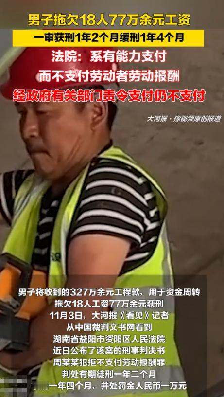 “大快人心!”近日,四川资阳,一老板在收到了327万元工程款后,却拒不给工人结清工资,而是把这些钱用来周转其他项目,结果拖欠了18名工人77.9万余元工资,最终被法院依法判处有期徒刑!网友:早知如此何必当初啊。 2020年说,资阳的周老板承包了一个厂房的消防工程,然后请来了18名工人负责施工。 工人们辛苦工作了几个月,工程也顺利完成,验收也通过了。 按理说,工程结束了,工资应该支付了,但周老板在拿到工程款后,心思就不在支付工资上了。 从工程完工到2024年7月,周老板陆续收到了327万元的工程款。 按道理,这笔钱足够支付工人们的工资,还有剩余。 但周老板想着能把这些钱用来周转其他项目,赚更多钱,于是决定把77.9万工人工资压下来,根本不提支付工资的事。 工人们等了很久,工资没有发,他们家里都需要这笔钱来支付房租、供孩子上学、给老人看病,急得不行。 一开始,周老板还找借口推脱,说是“工程款没到齐”“资金周转困难”。 但到最后,他干脆就避开了工人的电话,甚至不回复消息。 18名工人一看这样下去不行,就决定联合起来,找周老板要工资。 可周老板依旧不为所动,于是他们只能向政府求助。 2025年1月,资阳区人社局介入调查,结果发现周老板完全有能力支付工资,但依然拒不支付,最终下达了《限期改正指令书》。 不过,周老板根本不在乎这些。 他觉得拖欠工资只是民事纠纷,最多就是拖拖而已。 没想到,他的行为已经触犯了法律。 周老板拖欠了18名工人近78万元,这样的数额已经达到“数额较大”的标准,法律规定他必须承担刑事责任。 法院审理后,认定周老板明明有能力支付却拒不支付劳动报酬,且在政府要求支付后依旧不支付,最终判定他构成“拒不支付劳动报酬罪”,判刑一年两个月,缓刑一年四个月,并处罚款一万元。 这个结果一公布,网友们纷纷点赞,觉得“就该这么判”。 很多网友表示,老板拖欠工人工资不仅影响了工人的生活,还违反了法律规定。 大家都在看着周老板的下场,感叹他“捡了芝麻丢了西瓜”。 327万的工程款,拿出来支付77万工资根本不成问题,可他偏偏心生贪念,把钱用在其他项目上,结果不仅没赚到更多,反而触犯了法律。 现在他不仅要面临牢狱之灾,名声也彻底臭了,以后谁还敢跟他合作? 相反,那些按时结清工资的老板,工人干活更卖力,生意做得越来越好,口碑也越来越好。 拖欠工资不是小事,它涉及到法律的底线。 工人的工资是他们辛辛苦苦挣来的血汗钱,老板按时结清工资不仅是法定义务,更是做人的基本道德。 而对于劳动者来说,如果遇到拖欠工资的情况,千万不要忍气吞声,应该及时采取法律手段,向有关部门投诉或向法院起诉,维护自己的权益。 周老板的下场,正是自作自受,他用亲身经历告诉大家,“伸手必被捉”。 希望所有老板都能从中吸取教训,敬畏法律、诚信经营。 只有真心善待工人、坚守底线,生意才会长久,口碑才会越来越好。 对此你怎么看? 信源:豫视频