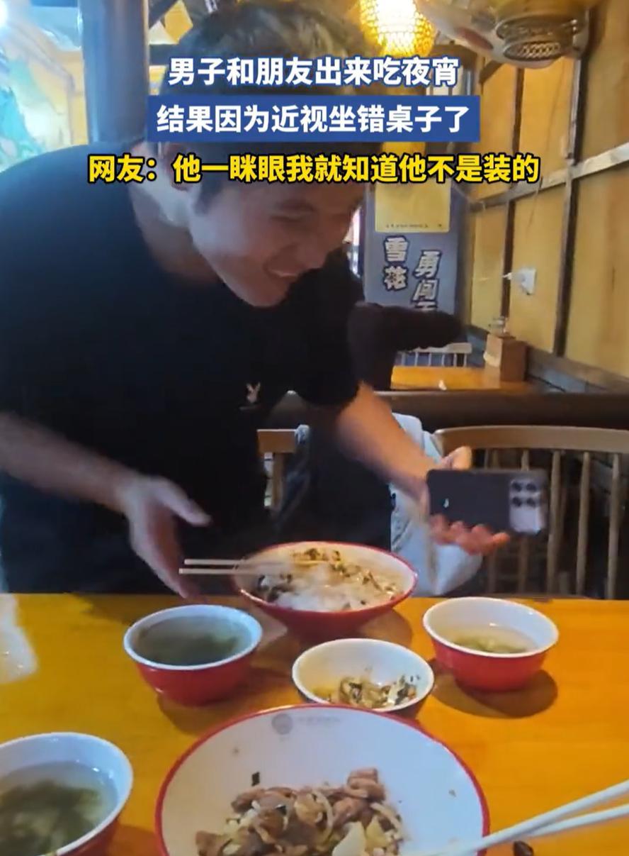 “这下尴尬了!”湖北,两名男子半夜外出吃宵夜,没想到,其中一名男子因为近视眼,直接坐错了桌子,津津有味的吃了起来,要不是朋友提醒,恐怕等他吃完了,还没发现坐在对面的是一个陌生人。网友:太真实了! 11月1日深夜十一点多,湖北街头的夜市还没歇火,一家亮着暖黄灯光的小面馆里,两张相邻的桌子正上演着一幕让人忍俊不禁又心头一暖的插曲。 当时面馆里人不算少,靠窗的桌子旁,两个年轻小伙刚点了两碗牛肉面,热气腾腾的汤面端上来时,戴眼镜的小伙皱了皱眉,味儿有点淡,我去加勺辣。 他起身时还跟朋友搭了句话,转身走向调料台时,顺手扶了扶鼻梁上的黑框眼镜。 等他端着加好调料的小碗回来,店里的灯光刚好被路过的客人挡了一下,他扫了眼近处的桌子,见有个空位就一屁股坐了下去。 对面坐着个穿深色外套的大哥,正低头嗦面,抬头扫了他一眼后,手里的筷子压根没停。 这边坐错桌的小伙也没察觉不对,拿起桌上的筷子就往碗里戳,一口面配一口蒜,吃得那叫一个香。 邻桌的朋友一开始还以为他跟那大哥认识,琢磨着“啥时候多了个熟人”,可看了两分钟就发现不对,俩人全程零交流,一个埋头吃面,一个啃着蒜,气氛怪得好笑。 直到面快吃了一半,朋友实在憋不住,小声喊了句他的名字。 小伙听见声音,从碗里抬起头,眼神迷茫地往四周扫,接着下意识地把眼睛眯成一条缝,脑袋还微微前倾,那模样像极了近视的人找东西时的样子。 就这一个动作,后来看视频的网友都笑了,这绝对是真近视,装都装不出来! 等他终于看清朋友在邻桌冲他挥手,脸上的表情瞬间变了:先是愣了两秒,接着嘴巴张成“O”型,最后耳朵尖都红了,手里的筷子差点掉在桌上。 没想到那大哥倒是挺淡定,看他尴尬,还摆了摆手,没事没事,面够吃。 其实仔细想想,这事儿之所以能让这么多人共鸣,不只是因为戳中了近视群体的日常,更因为那大哥的宽容。 换作有些人,遇到陌生人坐错桌、吃自己的面,可能早就皱着眉质问了,可他没这么做,一句“没事”就让尴尬变成了小插曲。 其实我们每个人都可能有“坐错桌”的时候,可能是不小心犯的小错,也可能是没看清的细节。 少一点指责,多一点包容;少一点急躁,多一点观察,那些差点变成“社死”的瞬间,说不定就能变成回忆里的小温暖。 毕竟,生活不是非黑即白的试卷,多给别人一点理解,也是给生活多留一份温度。 毕竟每个人都可能有盲区,多一份理解,少一份误判,日子才会更有滋味。
