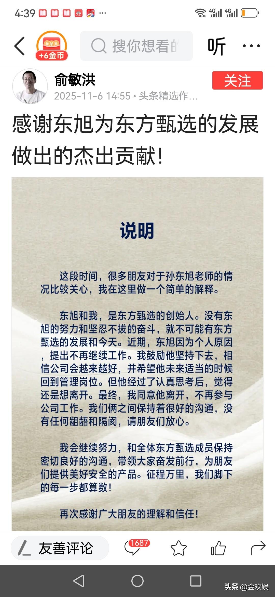 俞敏洪,终于正式官宣孙东旭离职了! 11月6日下午,俞敏洪在自己的社交平台上晒出一张说明书并配文:“感谢东旭为东方甄选的发展做出杰出的贡献!” 细看图中的说明书,原来是正式官宣孙东旭离开东方甄选了。 俞敏洪说不是不要他,而是孙东旭因为个人原因选择离开的。 俞敏洪很不舍,挽留他,鼓励他继续留下,还承诺未来让他再回到管理岗位,可他还是决定离开了! 网友看完,评论说,看起来一切传言都并非空穴来风,之前一再辟谣孙东旭离职,说是休长假,最终却证实确实离职了。 只是俞敏洪还是很有情有义的,不断赞美孙东旭对东方甄选的贡献,只字不提他因小作文事件导致董宇辉的离开对东方甄选造成的巨大损失。 也有网友认为,孙东旭此次决定离职是因为顿顿的离开,顿顿的离开是导致孙东旭离职的最后一根稻草。 俞敏洪这么详细地说明孙东旭的离职是他个人的选择,应该是怕失去孙东旭的粉丝,拥护孙东旭的网友也不在少数。