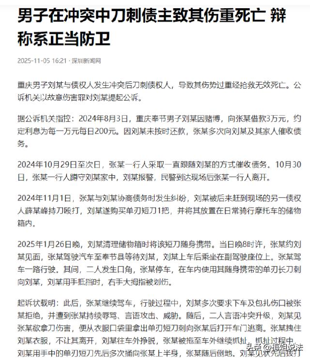 “为了点利息,把命搭进去了!”重庆,男子借了3万给一赌徒,每天的日息就有600元。到了约定还款的日子,赌徒当然没钱还,男子就划伤了赌徒,两人发生了激烈的肢体冲突,混乱间赌徒拿出准备的刀具刺向男子,最终男子抢救无效死亡。事后赌徒想以正当防卫脱罪,但最终还是以故意伤害罪提起了公诉。 深圳新闻网十一月五号报道了这则男子借3万给某赌债、日息600,划伤赌徒后被对方反杀的新闻,这到底是正当防卫还是故意杀人呢? 自从沉迷赌博后,刘某就成了个彻彻底底的赌徒,刚开始他的手气确实不错,赚了一笔钱。在尝到赚快钱的感觉后,刘某干脆辞去了工作,成天就想着一夜暴富。 日子一长,刘某之前赢到的钱全都吐出去了不说,之前的存款也早输了个精光。 为了赶本,刘某开始向家人朋友借钱,可赌博就是个无底洞,很快又输了个精光。在得知他是为了借钱赌博后,亲戚朋友再也没人愿意借钱给他了。 坚信自己下次一定能赢钱的刘某,开始铤而走险借起了高利贷,等到了还钱的日子没钱还,债主们就追到他家,揍了一顿后让他尽快还钱。 可就算这样,刘某还是沉迷于赌博,对此家人也彻底放弃了他。 时间来到二四年八月,刘某认识了老张。 老张同意借给刘某三万块钱,但日息竟高到600元,面对这么离谱的利息,着急用钱回本的刘某还是同意了。 很快就到了还款的日子,刘某当然没钱还,只是东拼西凑还了点利息,请求再宽限几天。 几天后老张再次上门要债,找不到刘某后,就去骚扰他的家人。 为了不让家人陷入麻烦,刘某偷偷报了警,看到民警来了,老张就先行离开了。 报警能拖得了一时,但解决不了一世,无奈刘某只得主动现身找到老张,希望再宽限几日,等有钱了马上就还。 就在两人谈判时,另一位债主薛某也找了过来,在见到刘某的瞬间,怒不可遏的薛某冲上来就是一脚,随后将他暴揍了一顿。 原来刘某一直在躲着薛某,这让苦寻多日的他,一看到刘某就气不打一处来。 在揍完刘某后,两位债主总算是出了一口气,随后表示让他尽快还钱,不然下次接着打。 刘某为了自保,买了把单刃刀放在摩托车后备箱内,以备不时之需。 之后的日子刘某继续过着躲躲藏藏的日子,时间很快来到了二五年的一月二十六号,这时离过年没几天了,这些债主肯定会催债的。 果然,当晚8点多,老张就开始联系刘某,让他赶紧还钱,不然就去他家闹。 没办法刘某只得将自己的位置发给了老张,很快对方就赶了过来,随后上了老张的的车。 怕有事发生的刘某提前将刀别在了身上,果然一见面两人就因为钱的事吵了起来,一气之下老张停好车,随后掏出刀朝刘某刺了过去。 猝不及防的刘某本能的拿手挡住了,右手大拇指被划出了一个大口子,鲜血直流。 见状怕出人命的老张选择了停手,并发动了车辆。 刘某手疼的厉害,要求老张带他去医院包闸下伤口。 老张正在气头上,自然不会同意,期间还多次辱骂刘某。刚开始刘某没有还口,可对方越骂越难听,刘某就跟着对骂了起来。 见对方还敢还口,老张又拿起了刀。刘某见状也慌了,掏出之前带的刀,胡乱的刺向了老张。 感觉刺到对方后,刘某就像开门跳车,可衣服却被老张死死的拉住。 因为车辆还在移动,为了安全老张只得先停车。趁着老张停车的功夫,刘某用力一拽,将老张整个人拖了下来。 虽然倒在了地上,但老张仍死死拉住了刘某的衣服,着急脱身的刘某拿起刀,胡乱的朝着老张上半身刺去,直到对方松开了后。 看着老张血流不止的样子,怕出人命的刘某选择了报警,并拨打了120。 遗憾的是老张还是于当晚11点左右,抢救无效宣告死亡。 事后民警以故意伤害罪逮捕了刘某,并见案件移交到了公诉机关。 那么,从法律角度,该如何判定刘某的行为呢? 根据《刑法》第二十条规定:“为了使国家、公共利益、本人或者他人的人身、财产和其他权利免受正在进行的不法侵害,而采取的制止不法侵害的行为,对不法侵害人造成损害的,属于正当防卫,不负刑事责任;正当防卫明显超过必要限度造成重大损害的,应当负刑事责任,但是应当减轻或者免除处罚;对正在进行行凶、杀人、抢劫、强奸、绑架以及其他严重危及人身安全的暴力犯罪,采取防卫行为,造成不法侵害人伤亡的,不属于防卫过当,不负刑事责任。” 本案中老张在接到刘某后,先是用到划伤了刘某,此时老张的不法侵害事实已成立,如果刘某这时候为了自卫,拿刀捅伤老张,就属于正当防卫。 事后虽然老张再次拿出了刀威胁刘某,但没有实施侵害的行为,只是拉住了他的衣服,刘某是为了脱身才拿刀刺伤老张,最终导致对方身亡,这时候就不属于正当防卫了。 目前,刘某的行为是否构成正当防卫或防卫过当,仍需要更多的证据来证明,刘某的辩护人也以刘某正当防卫为由,提出了辩诉意见,案件还在等待开庭审理中。 那么,对于这事你怎么看呢?