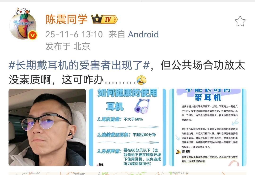 陈震:长期戴耳机的受害者出现了,但公共场合功放太没素质啊,这可咋办………[允悲] 不带耳机呗 ,小编上大学的时候经常戴着耳麦,其实时间长了听力确实会下降,后来不戴了恢复了一点。 长时间佩戴确实影响听力,其实也没有必要一天到晚听那么多音乐,不过有很多人不是为了听音乐,连刷视频的时候都戴着耳机。 各位是怎么看的?欢迎评论区留言。