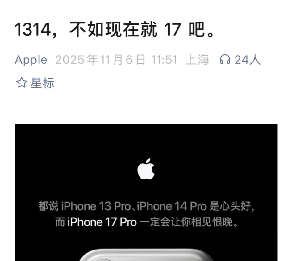 为什么苹果的广告语总是这么惊艳。 1314该换机了 这句文案不仅是谐音梗巧妙,而且是对主要目标群体的精准打击,13pro 14pro用户、现在去买17pro 是升级体验感最好的时候。
