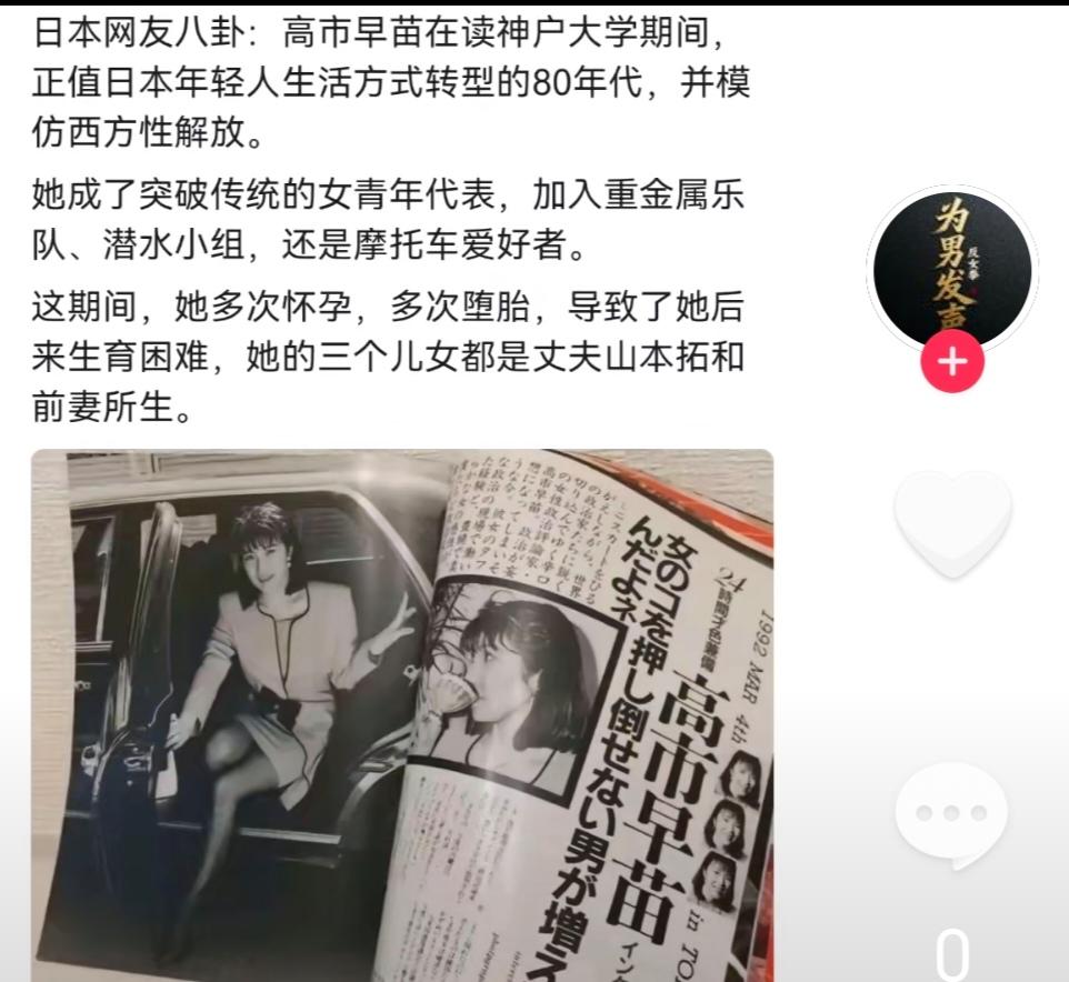 高市女年轻时确实有几分姿色!也是活跃分子,80年代日本X解放,搞事女也不堪落后,日本网民透露她多次怀孕坠胎,以至于后来不孕不育,她没有自己的亲生子女。出来混迟早要还的,年轻时玩过头了,受到惩罚。 但是这种陶醉于政治权力游戏中的女人不择手段、不计后果、不堪回首。