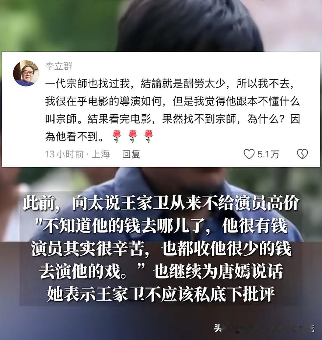 向太直言王家卫导演太抠门,从来不给演员高薪片酬,无论是谁都给的很少,永远不知道他的钱都花在了哪里。很快,李立群公开力挺向太,直接开喷王家卫,称王家卫给的钱就是少,根本不懂什么是宗师。换言之,李立群觉得王家卫拍的电影《一代宗师》很烂,就这德行是拍不出好片子的。 所以很多观众看完《一代宗师》也是一脸懵,情节支离破碎,节奏也慢,也不知道讲了什么,完全没有剧本,给人的感觉就是拍一堆素材,然后去剪辑好的素材,再去按照素材捋故事。客观来讲,王家卫的电影只有光影效果做的好,适合喜欢摄影的人观赏,喜欢看电影的人就很难喜欢了。 不过向太跟王家卫一直不对付这能理解,但是李立群这时候跳出来,多少有点落井下石了。大家觉得呢?欢迎留言。