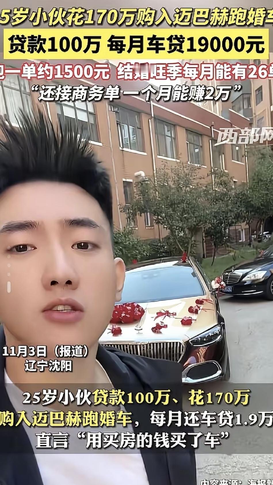 沈阳有个25岁小伙子,父母给他70万打算买房。但他全款买了辆迈巴赫S480,又贷款100万,说要跑婚庆赚租金。到了十月份结婚多的时候,光油费加车贷就花21500,才挣两万多,算下来还倒贴钱。平时淡季收入更少,现在跟女朋友租房子住,房租一年两万。算账发现赚的不够还贷的,连油钱都不够。但他说这是事业,天不亮就起床收拾车,闲着还拍视频招客户。现在车贷房贷压头,还不知道能撑多久。